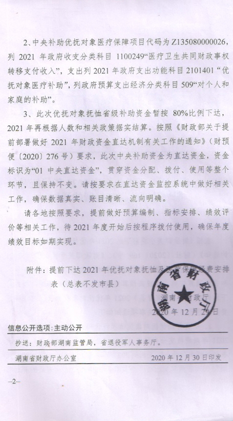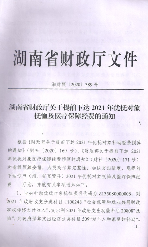 湖南省财政厅关于提前下达2021年优抚对象抚恤及医疗保障经费的通知