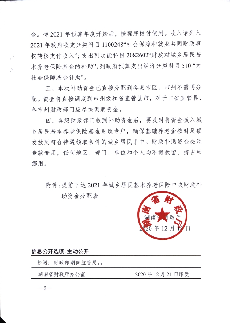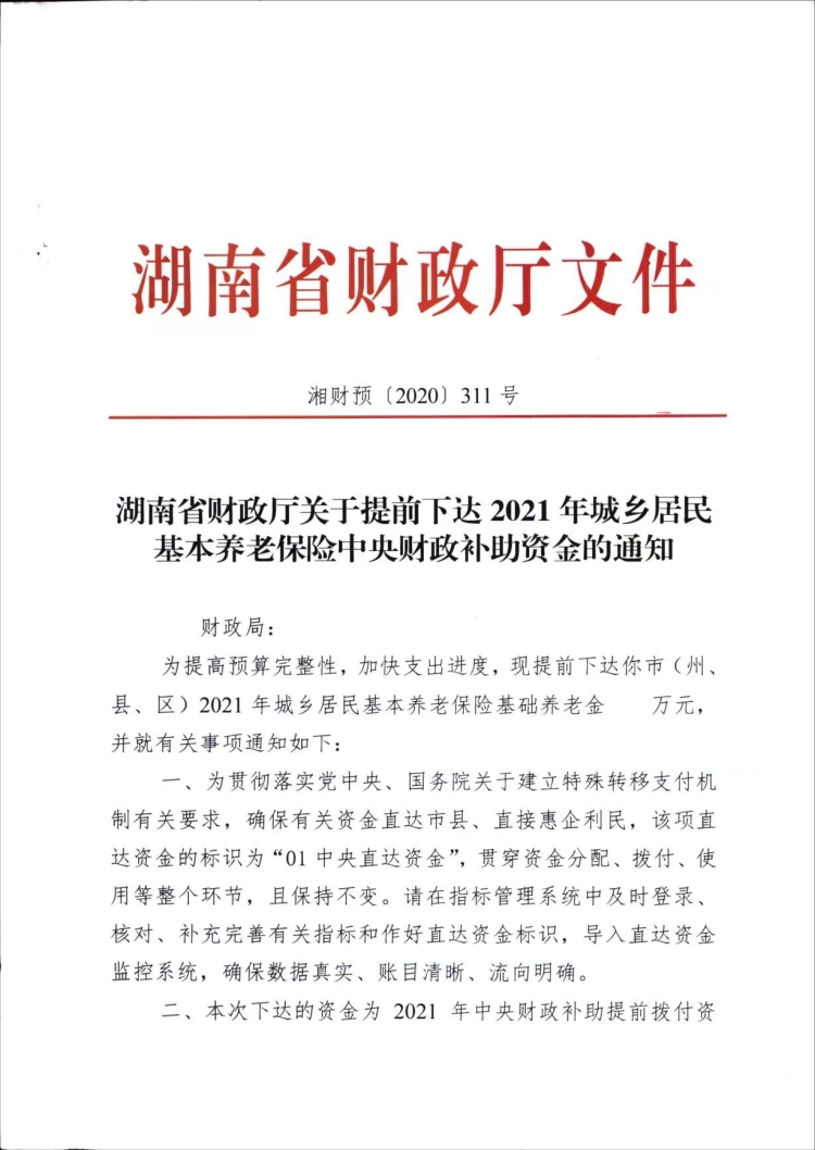 湖南省财政厅关于提前下达2021年城乡居民基本养老保险中央财政补助资金的通知