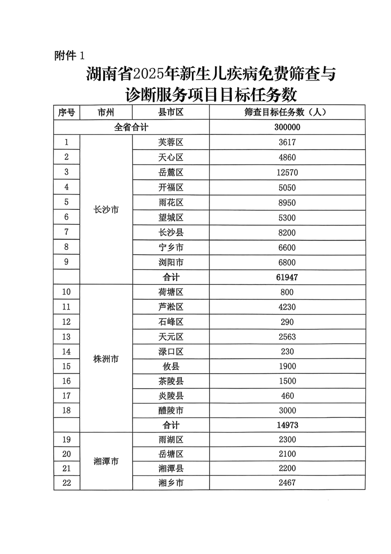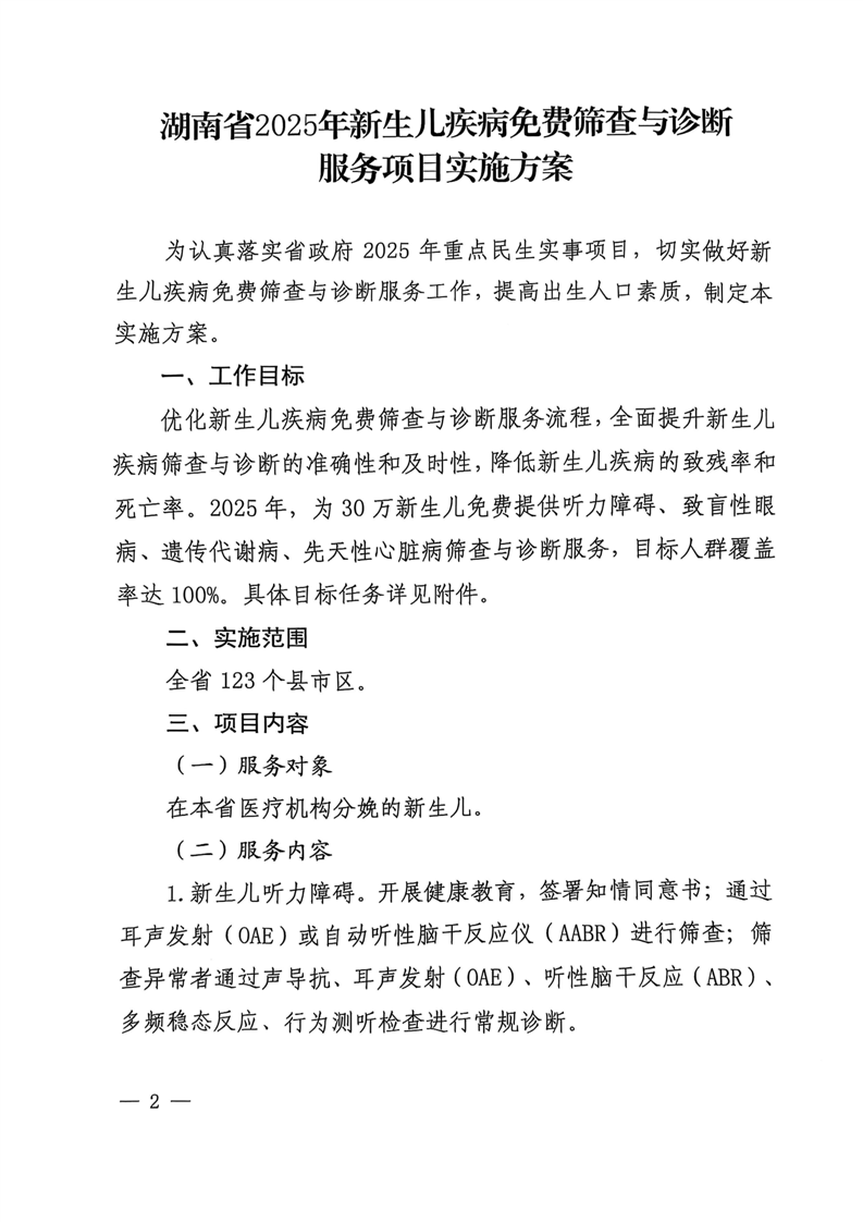 湖南省2025年新生儿疾病免费筛查与诊断服务项目实施方案