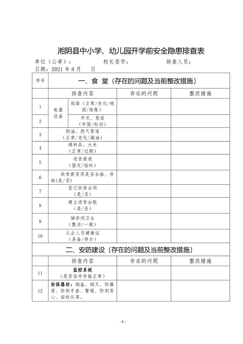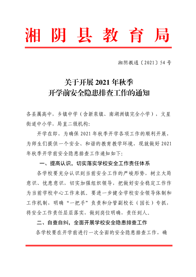 湘阴教通〔2021〕54号关于开展2021年秋季开学前安全隐患排查工作的通知