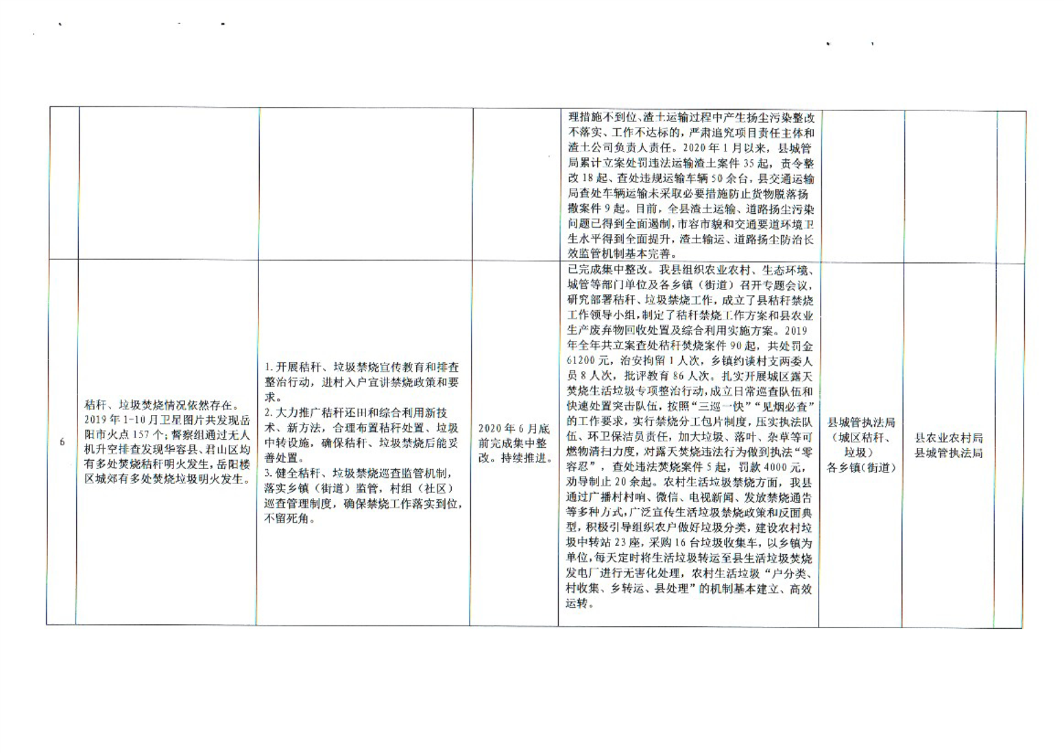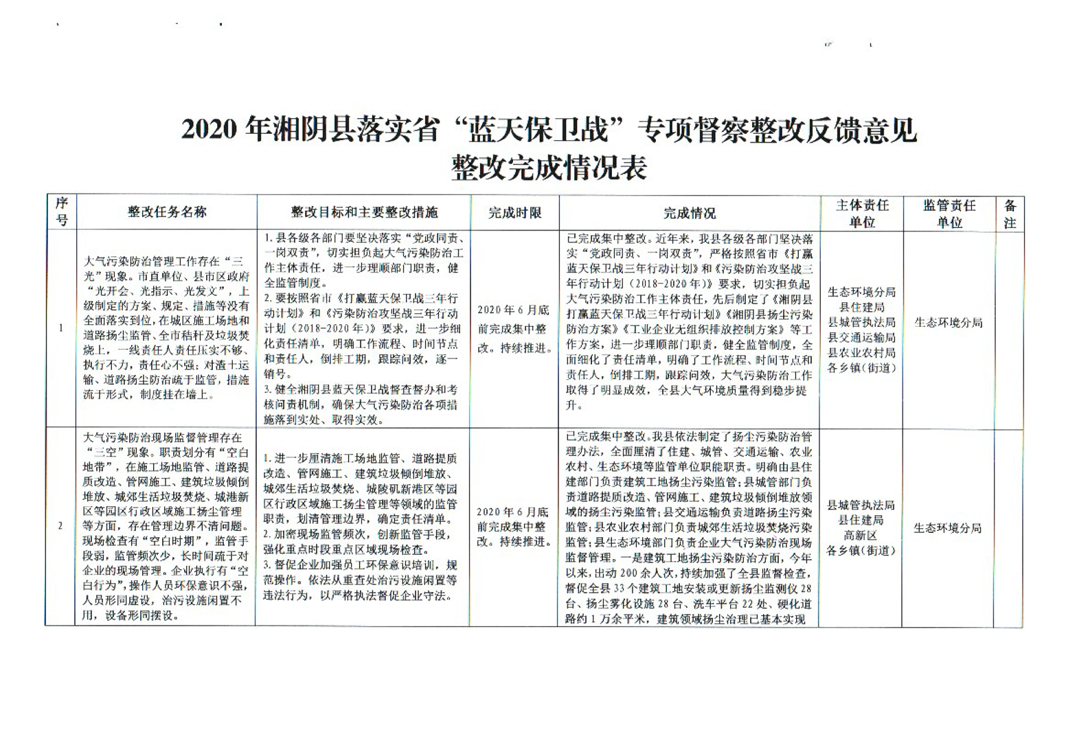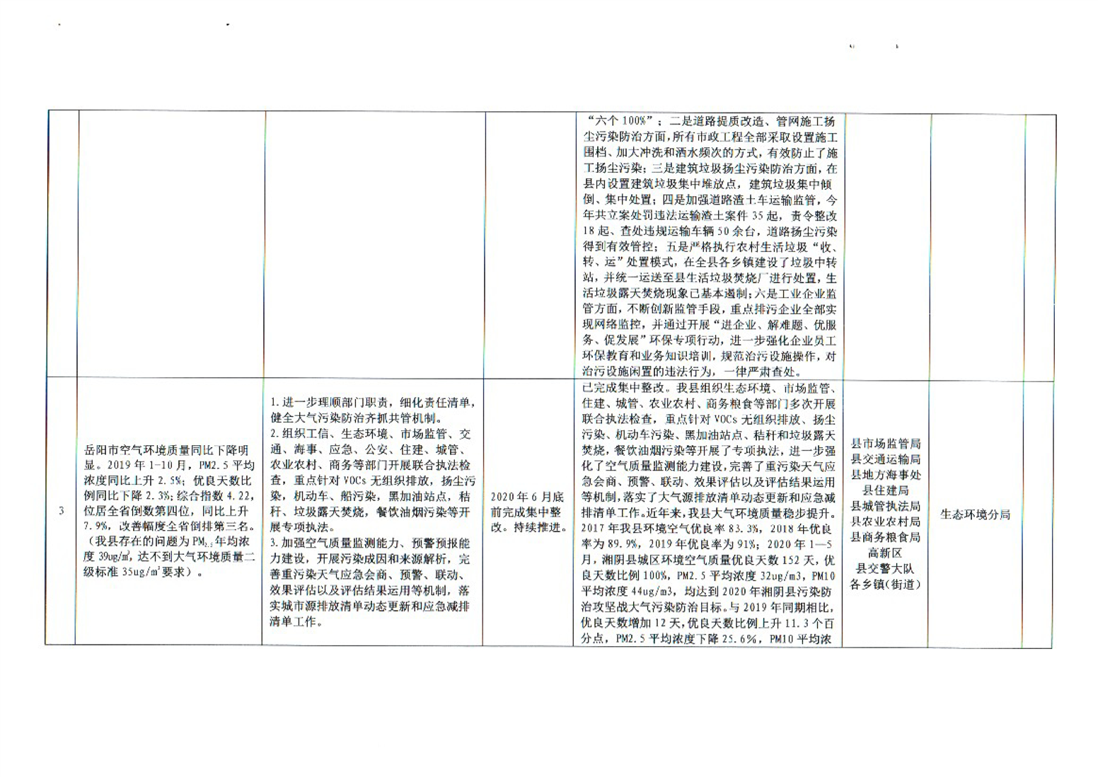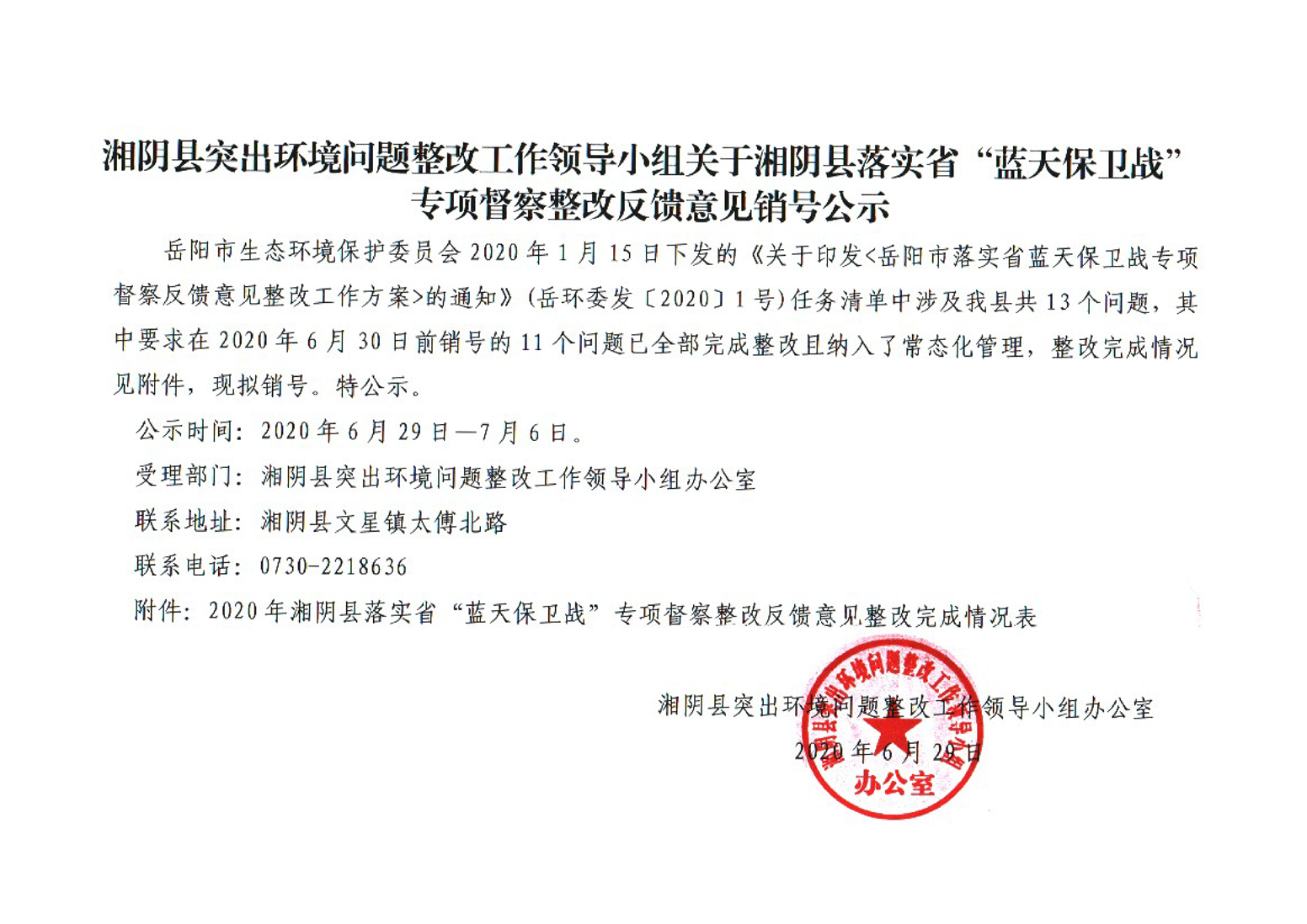 湘阴县突出环境问题整改工作领导小组关于湘阴县落实省“蓝天保卫战”专项督察整改反馈意见销号公示
