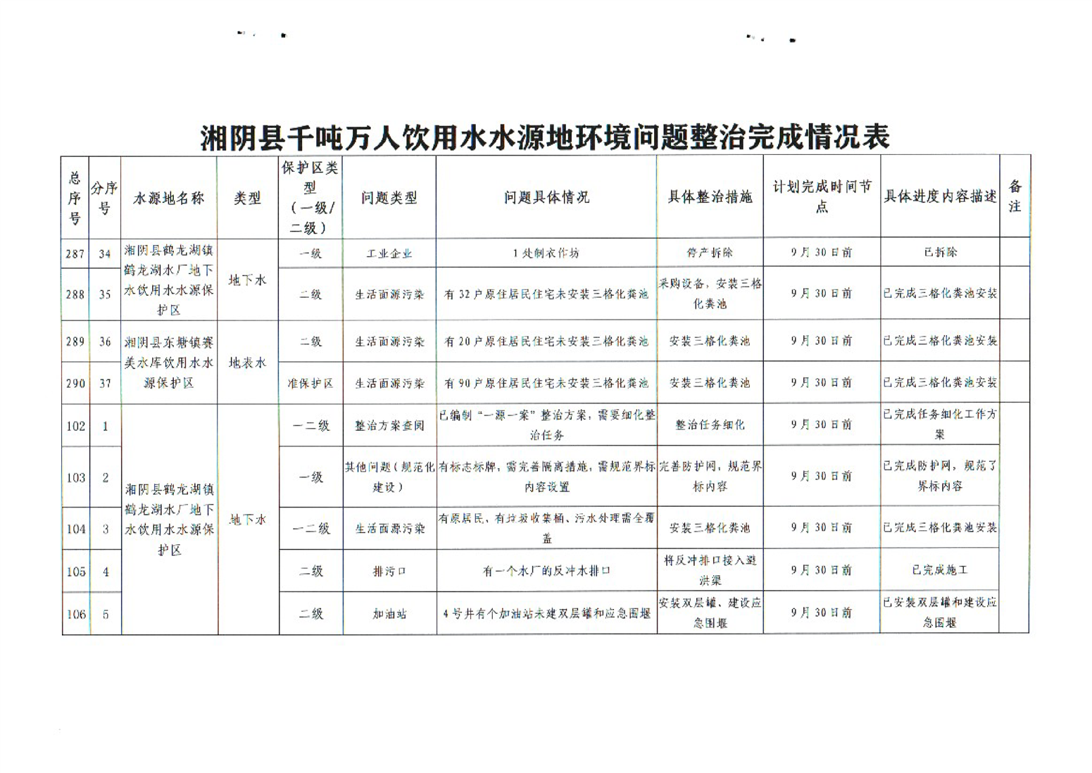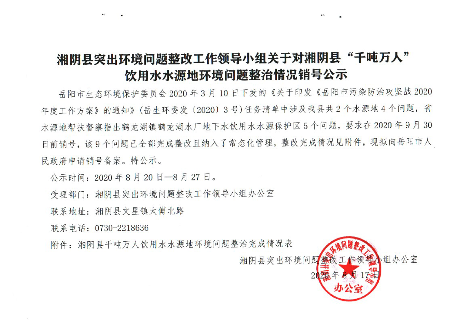 湘阴县突出环境问题整改工作领导小组关于对湘阴县“千吨万人”饮用水水源地环境问题整治情况销号公示