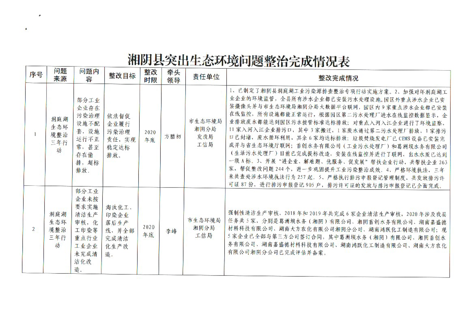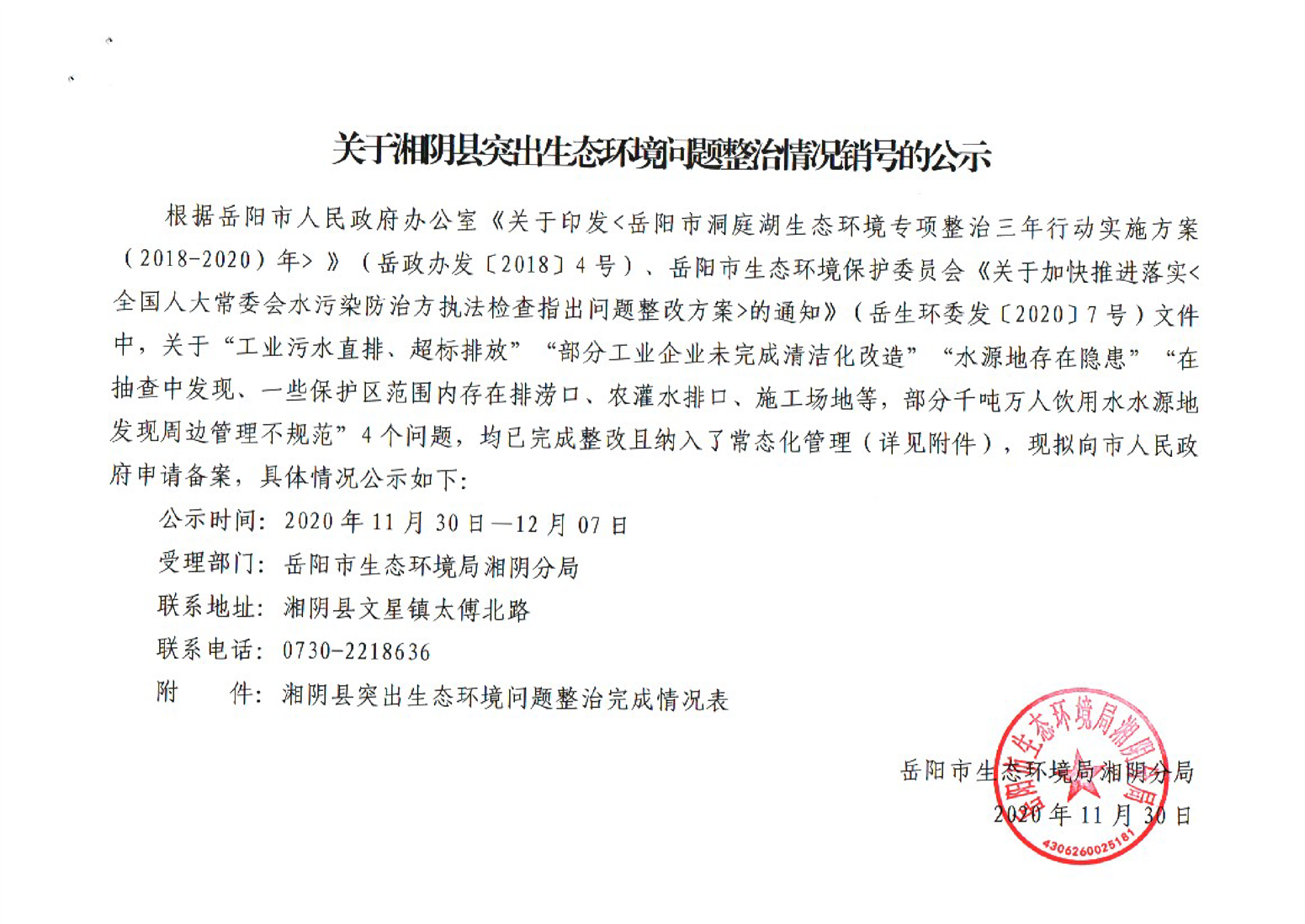 关于湘阴县突出生态环境问题整治情况销号的公示