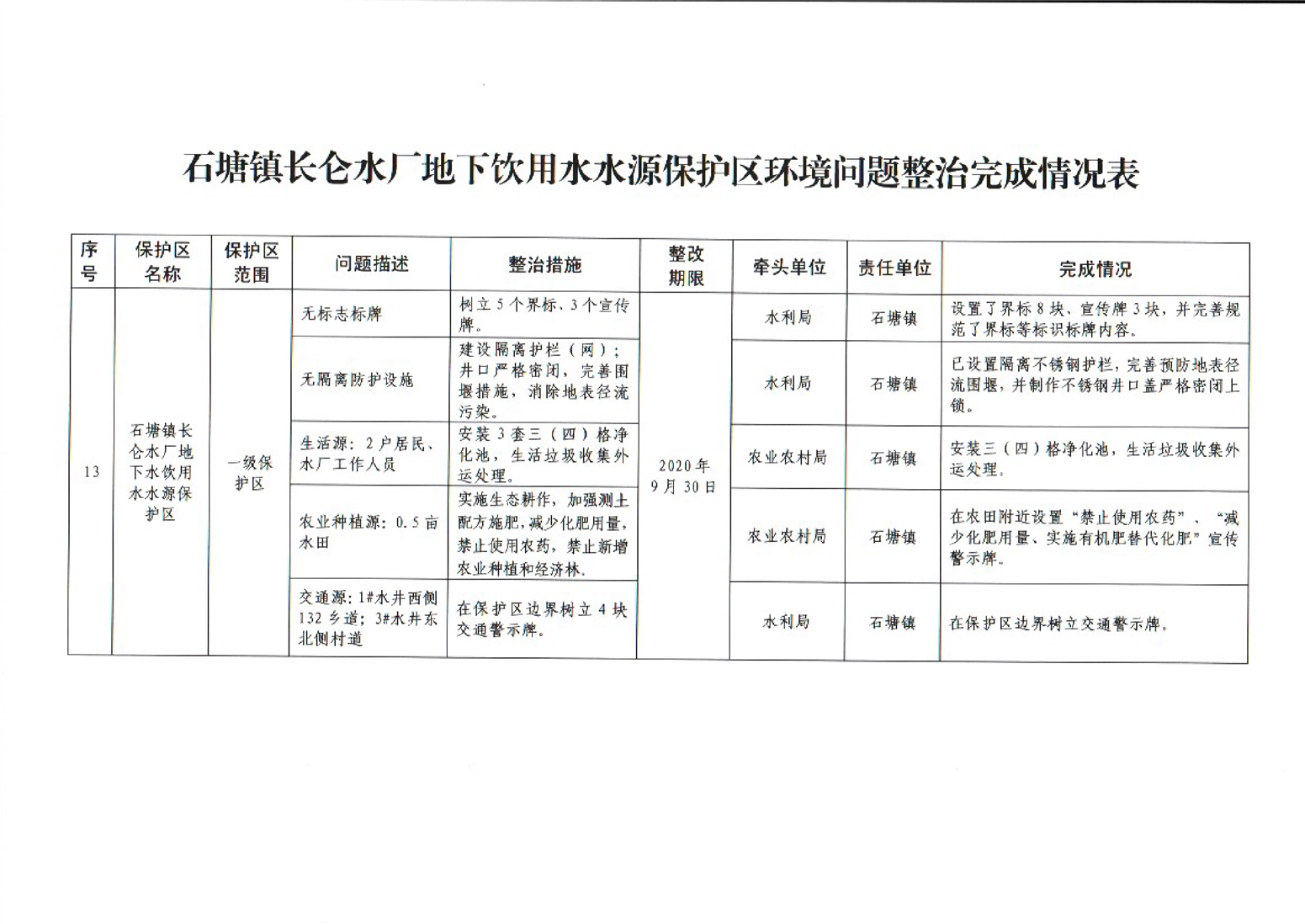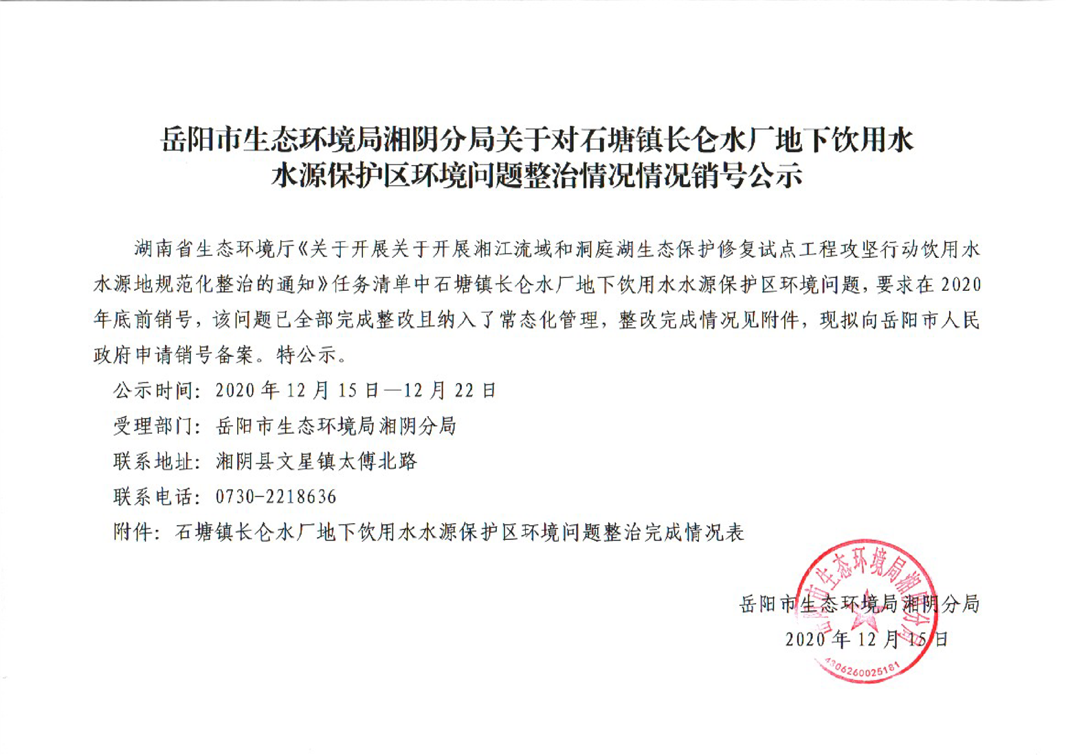 岳阳市生态环境局湘阴分局关于对石塘镇长仑水厂地下饮用水水源保护区环境问题整治情况销号公示