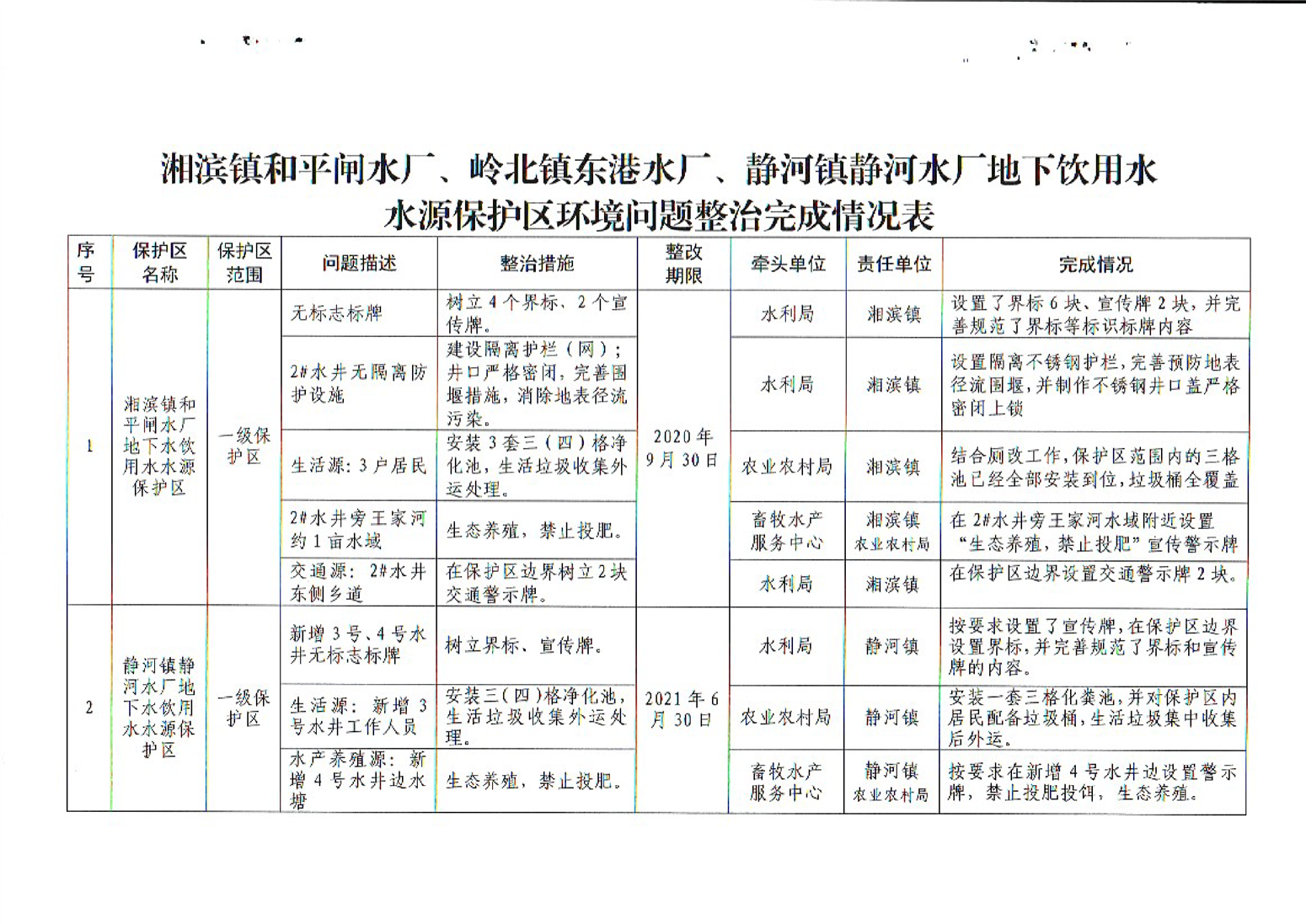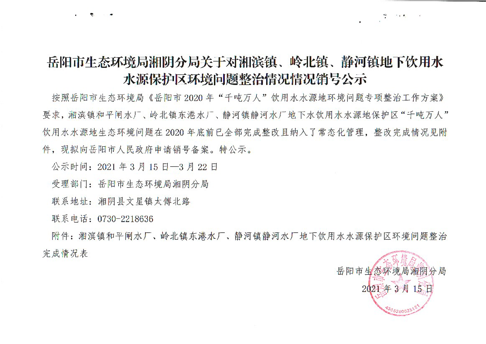 关于对湘滨镇、岭北镇、静河镇地下饮用水水源保护区生态环境问题整治情况销号公示.