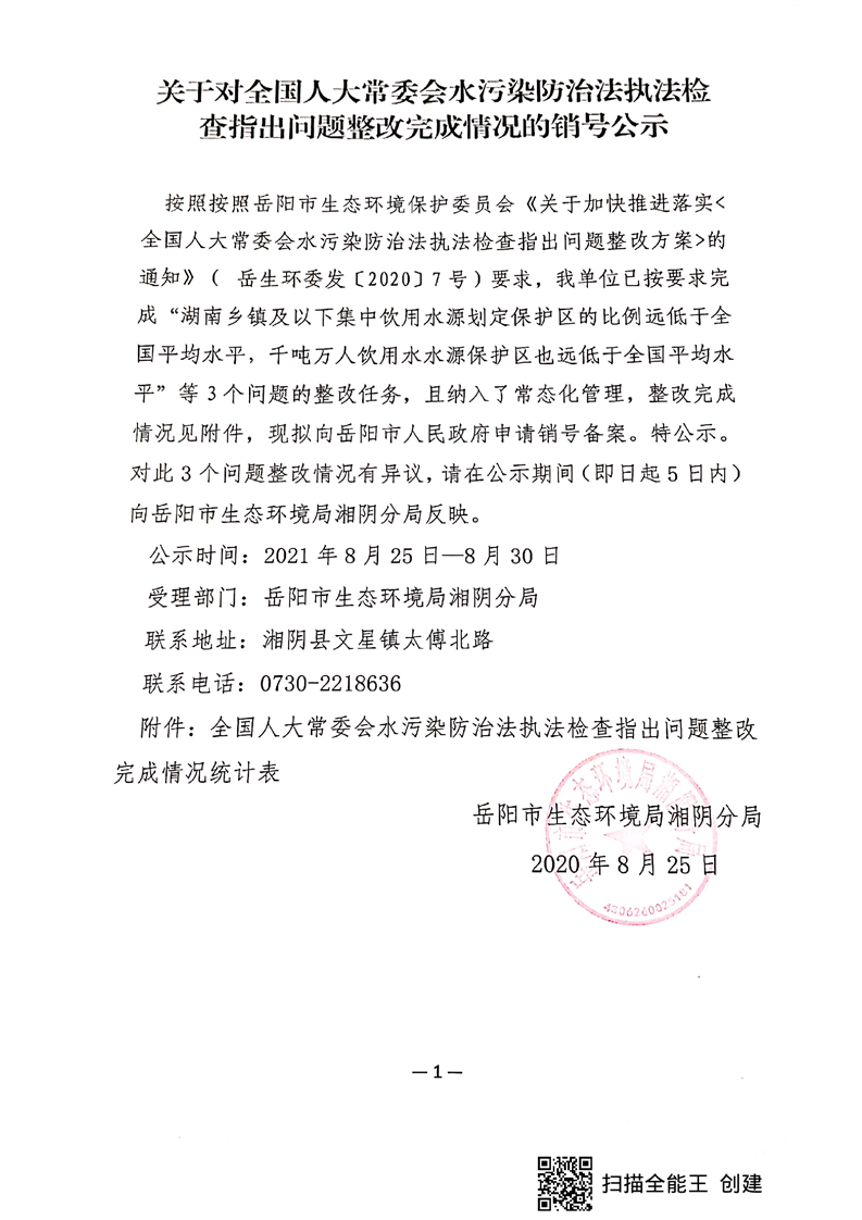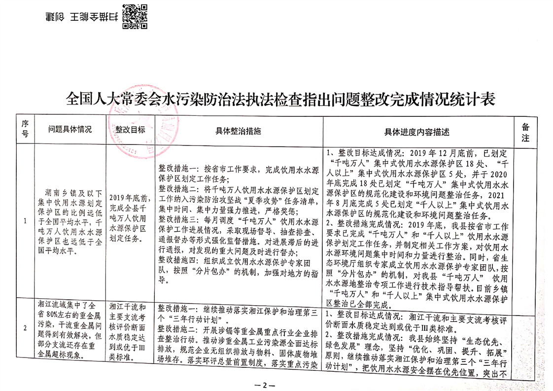 关于对全国人大常委会水污染防治法执法检查指出问题整改完成情况的销号公示