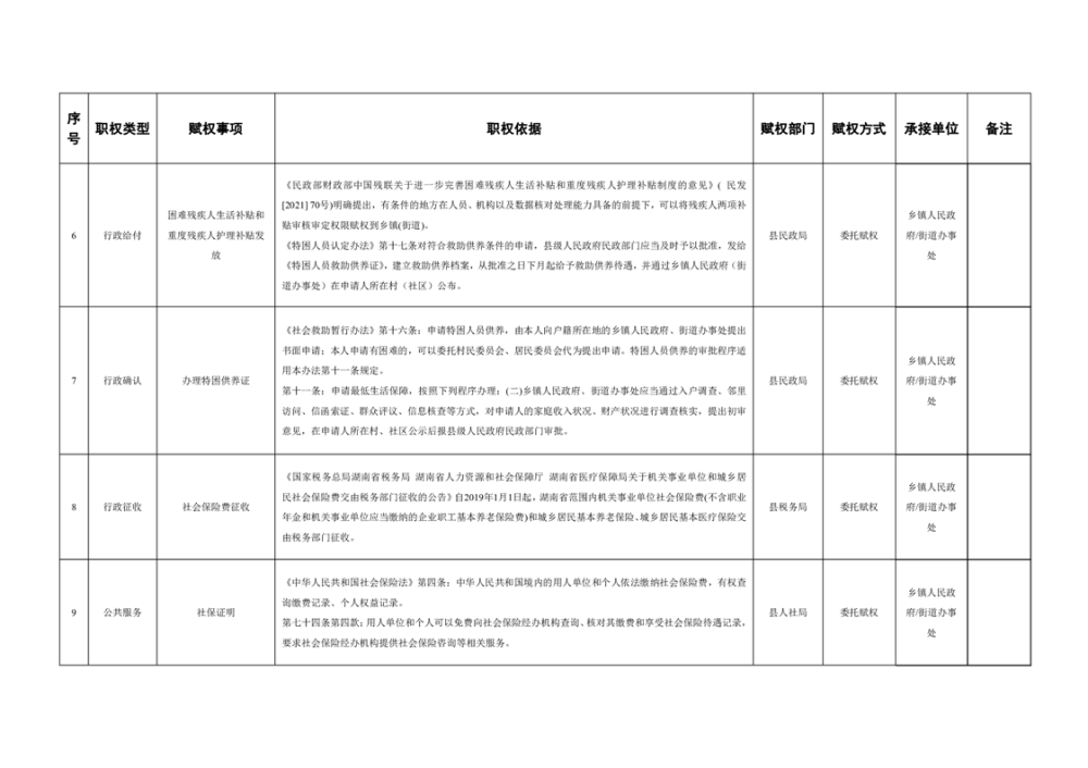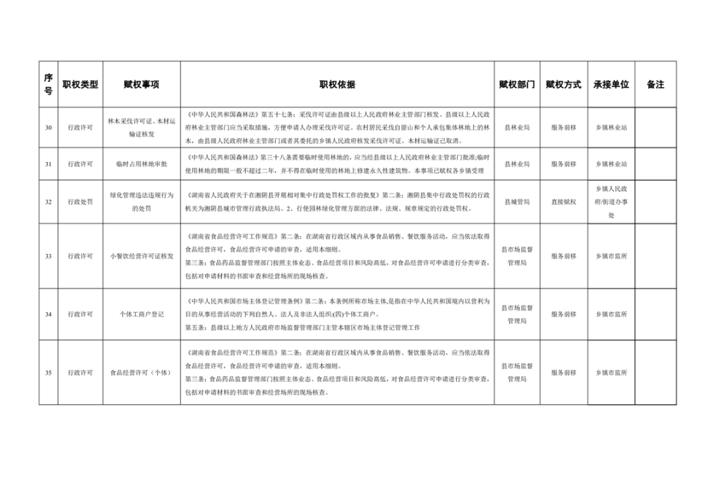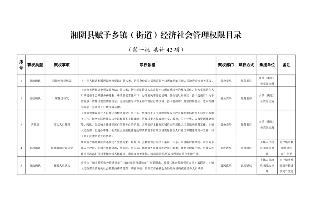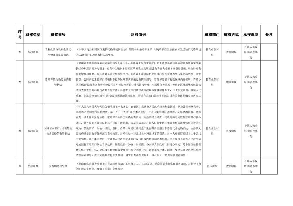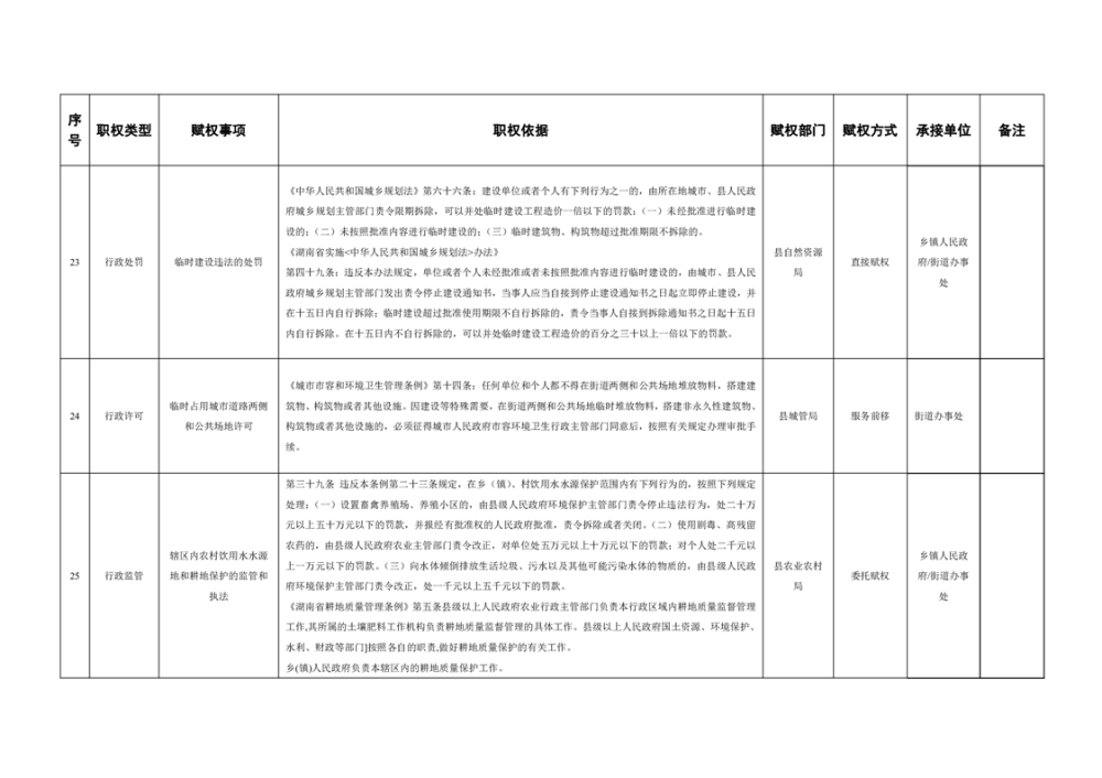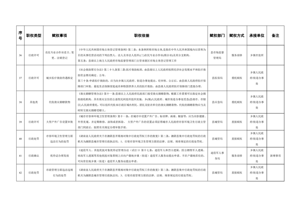 湘阴县赋予乡镇(街道)经济社会管理权限目录
