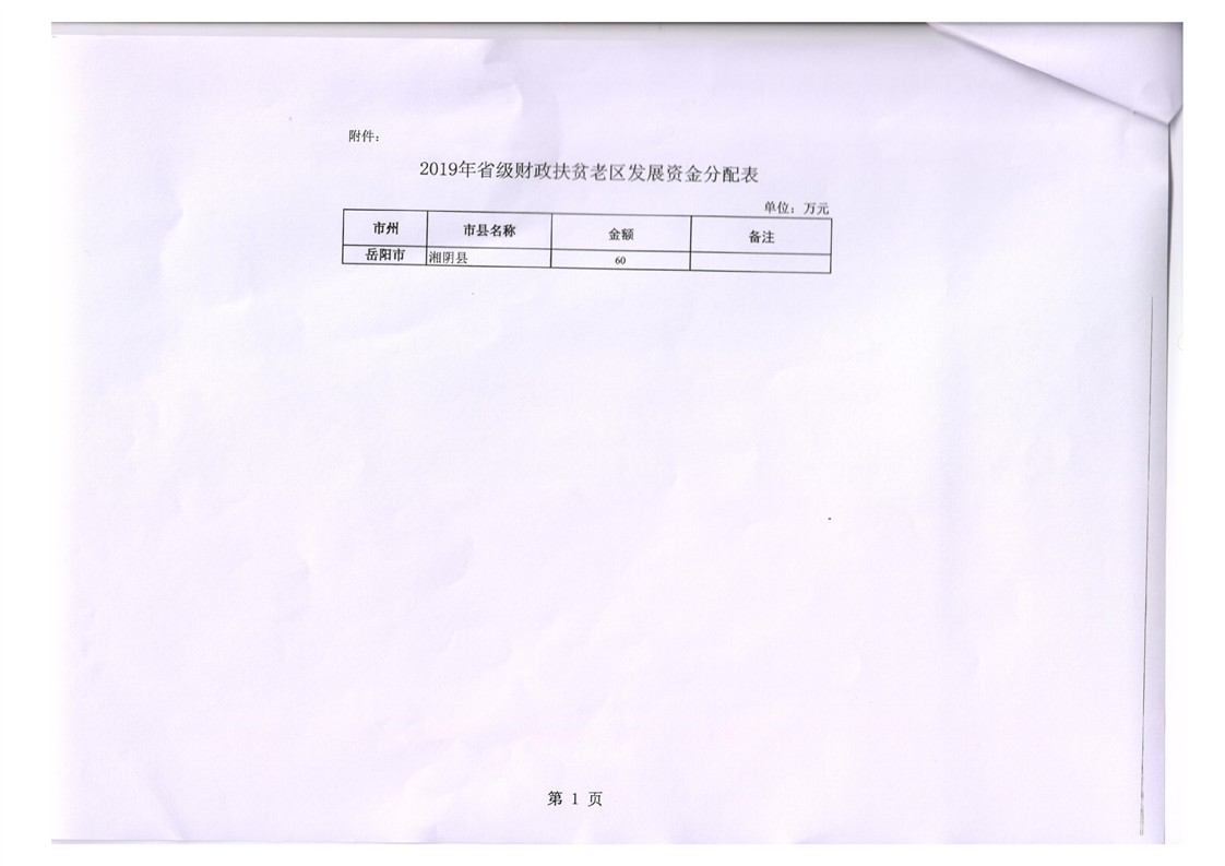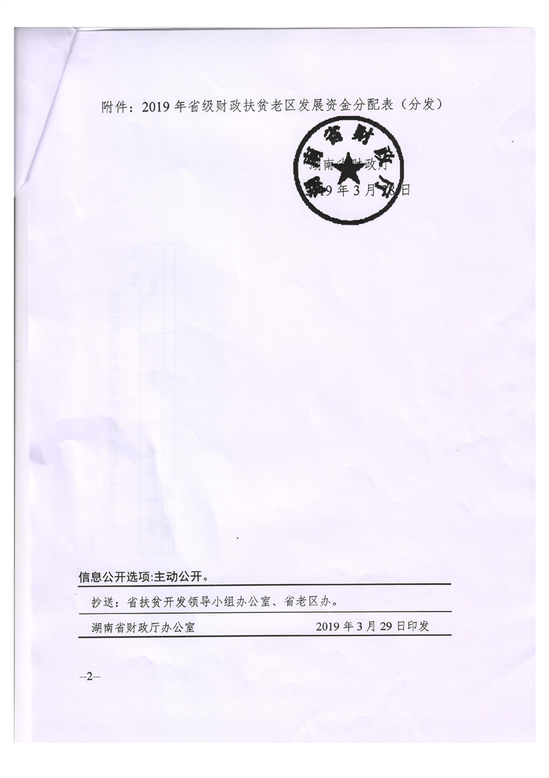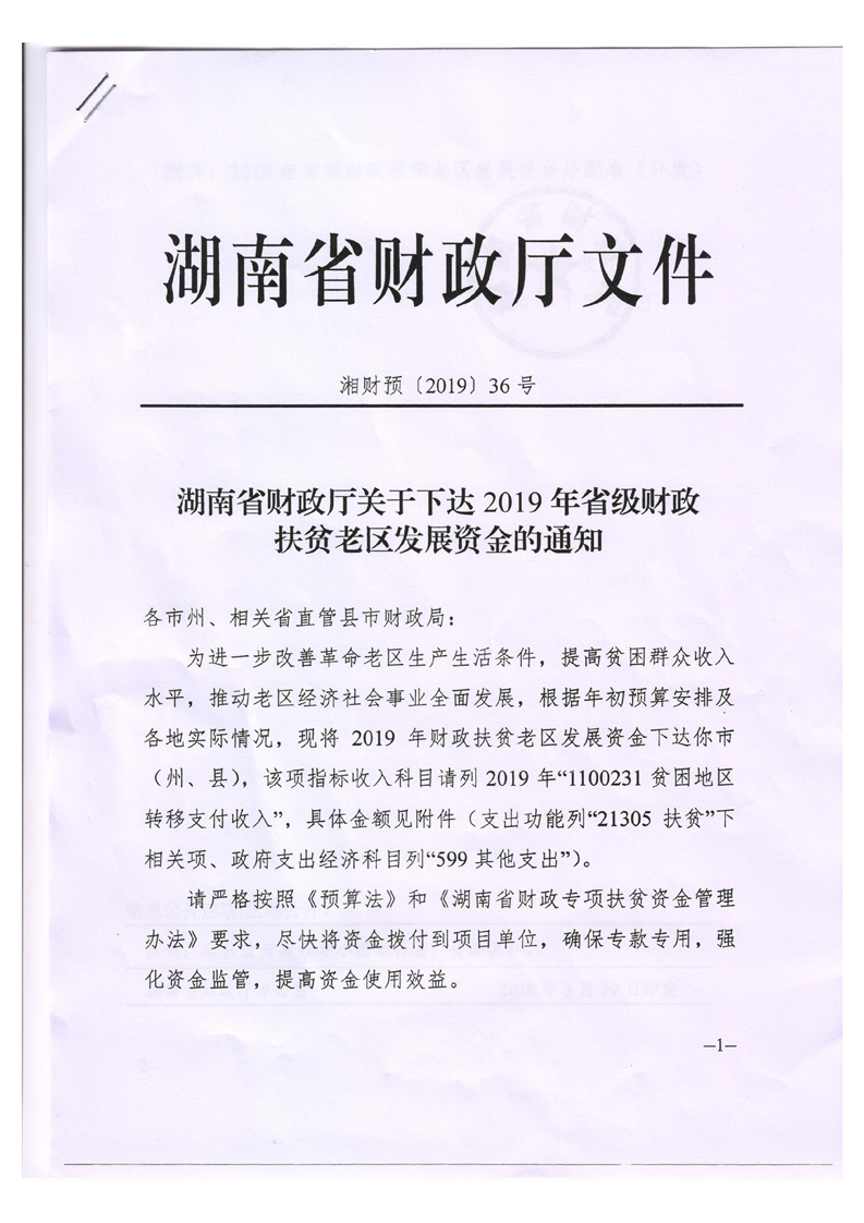 湖南省财政厅关于下达2019年省级财政扶贫老区发展资金的通知(湘财预[2019]36号)
