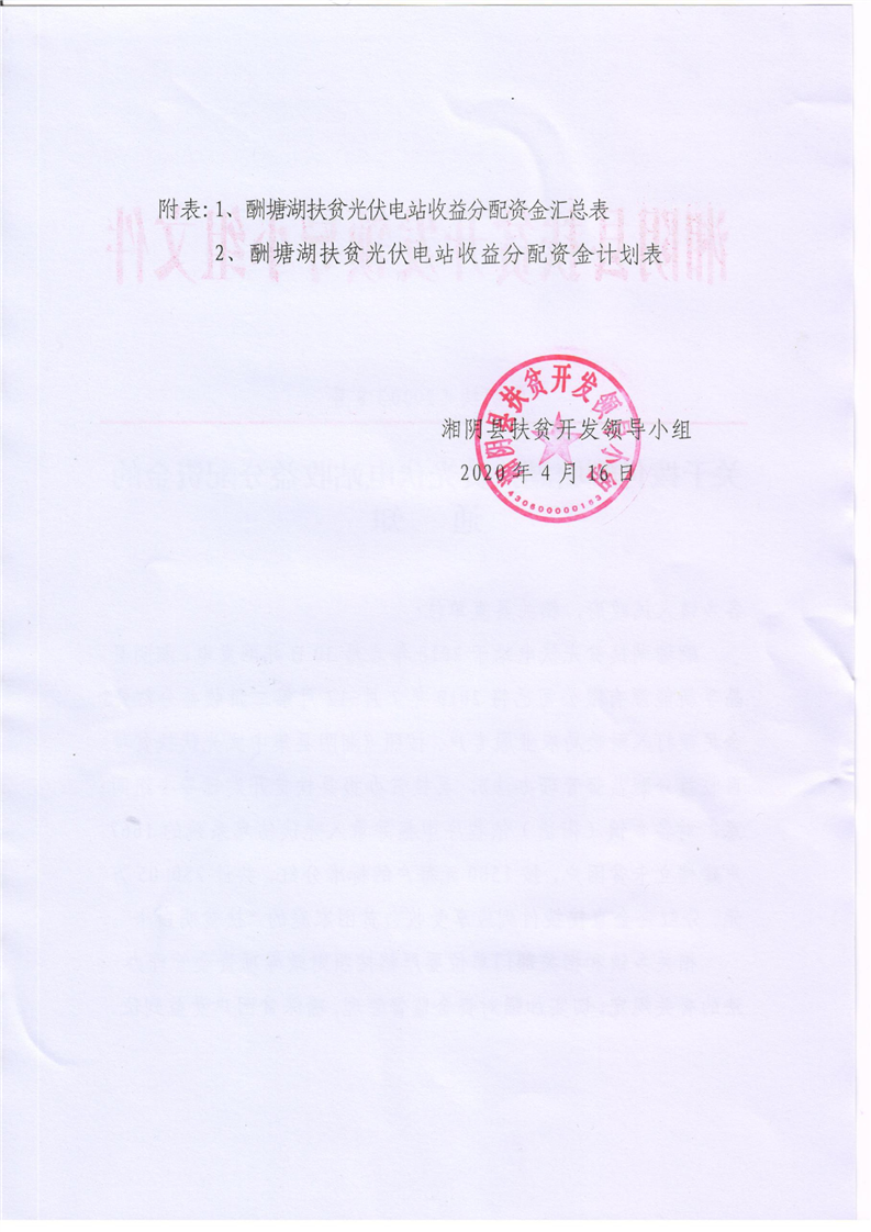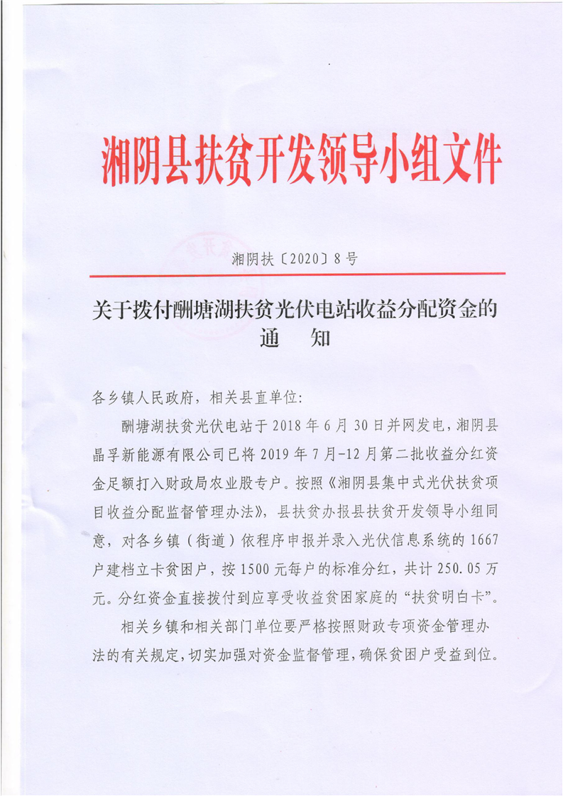 关于拨付2019年下半年酬塘湖扶贫光伏电站收益分配资金的通知