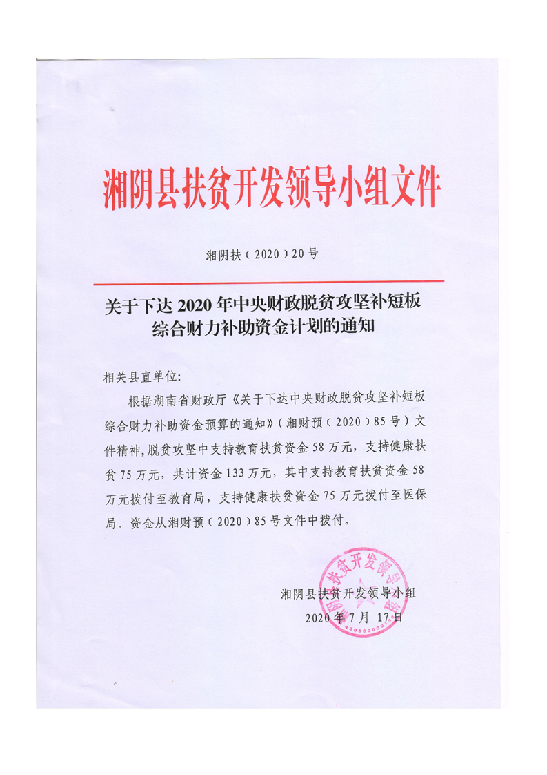 20号关于下达2020年中央财政脱贫攻坚补短板综合财力补助资金计划的通知