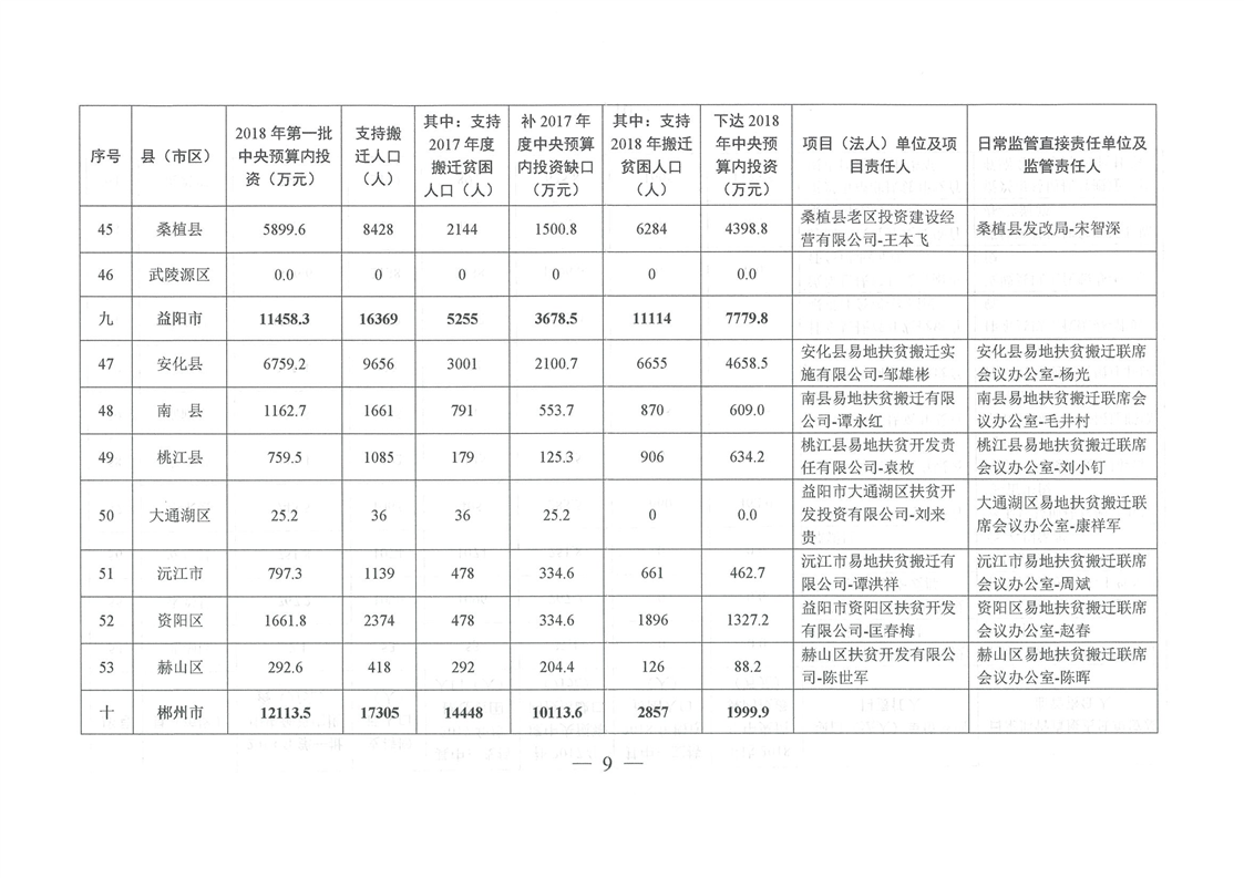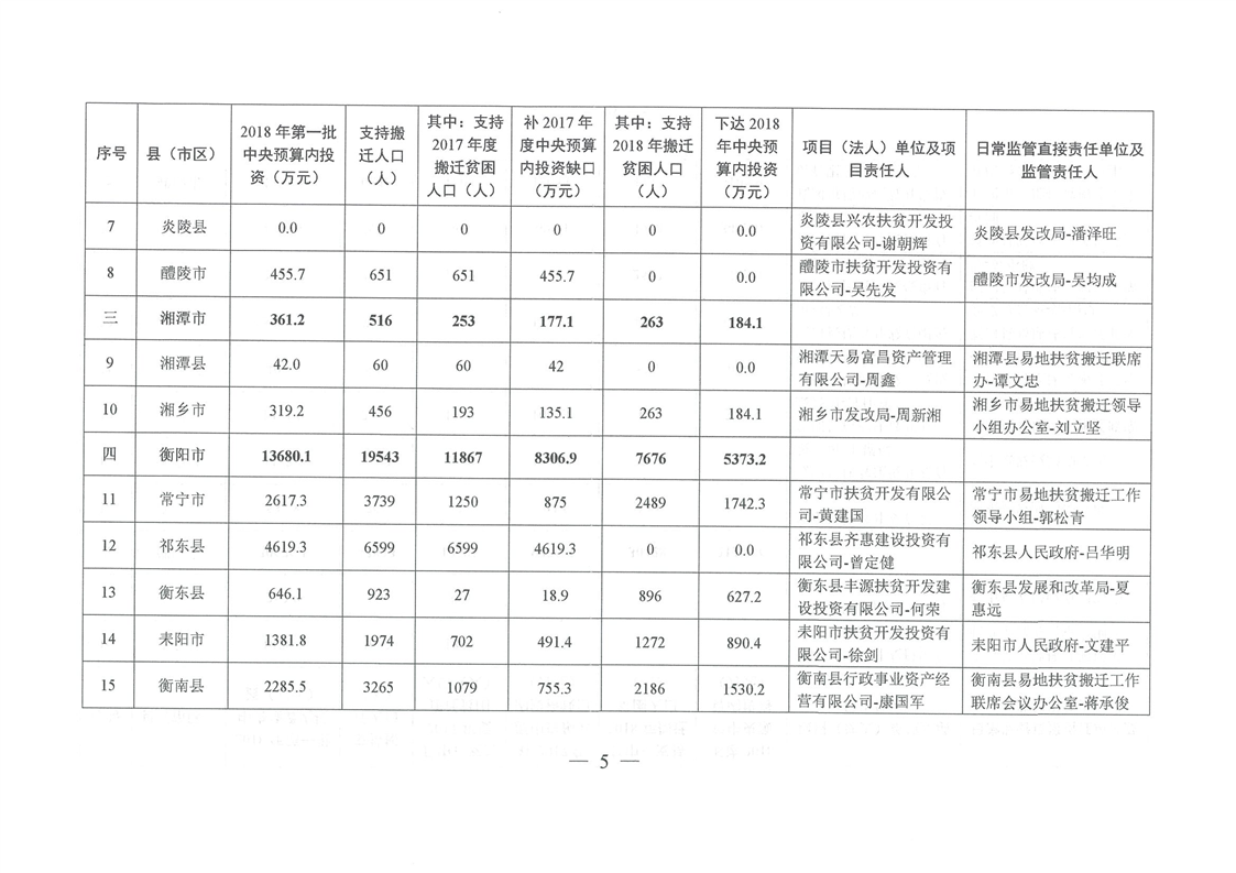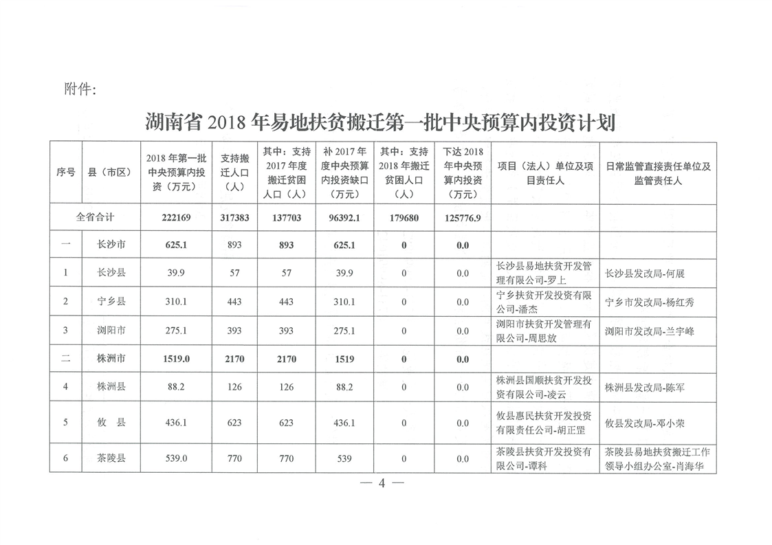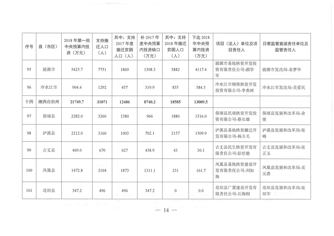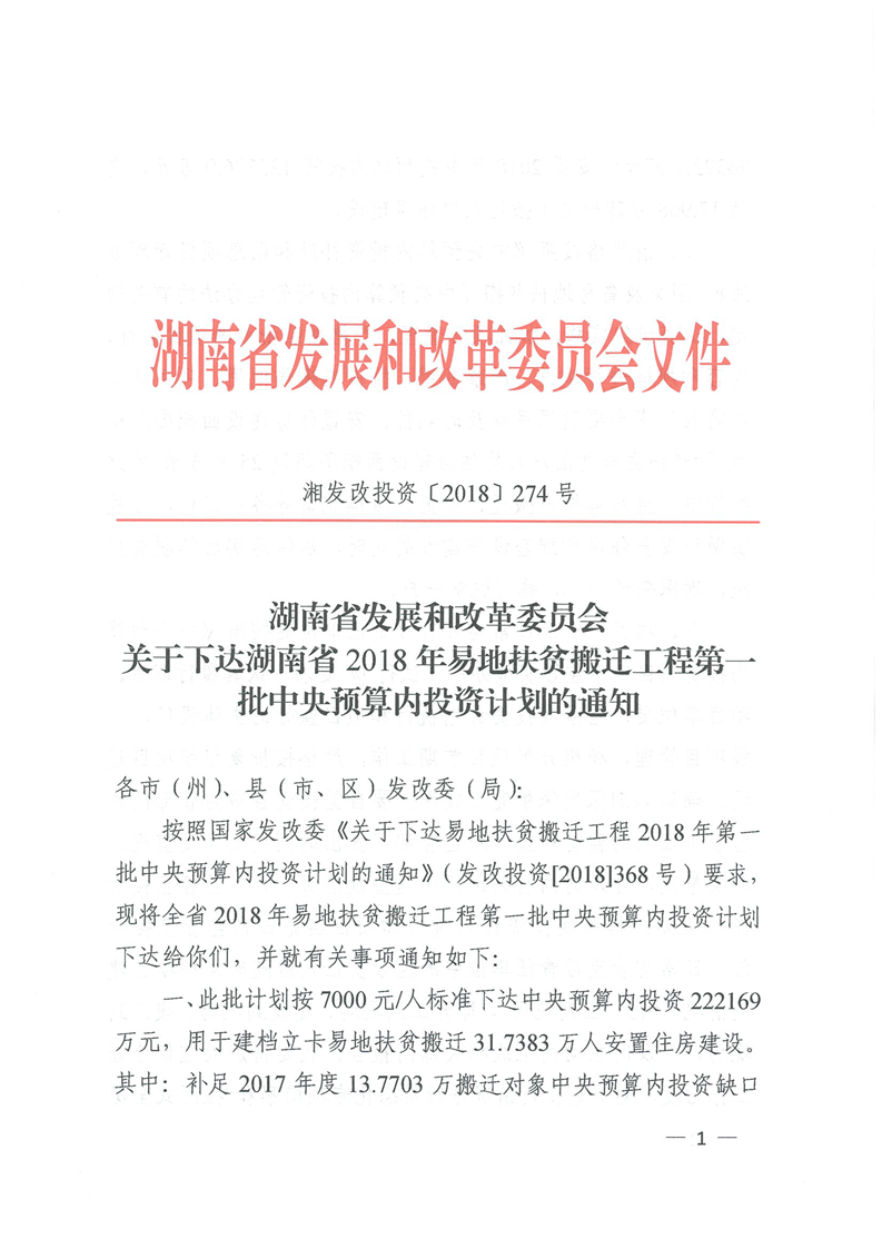 湖南省发展和改革委员会关于下达湖南省2018年易地扶贫搬迁工程第一批中央预算内投资计划的通知
