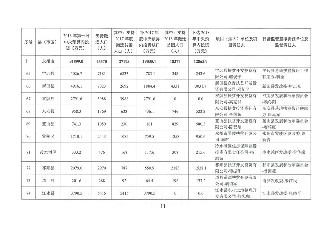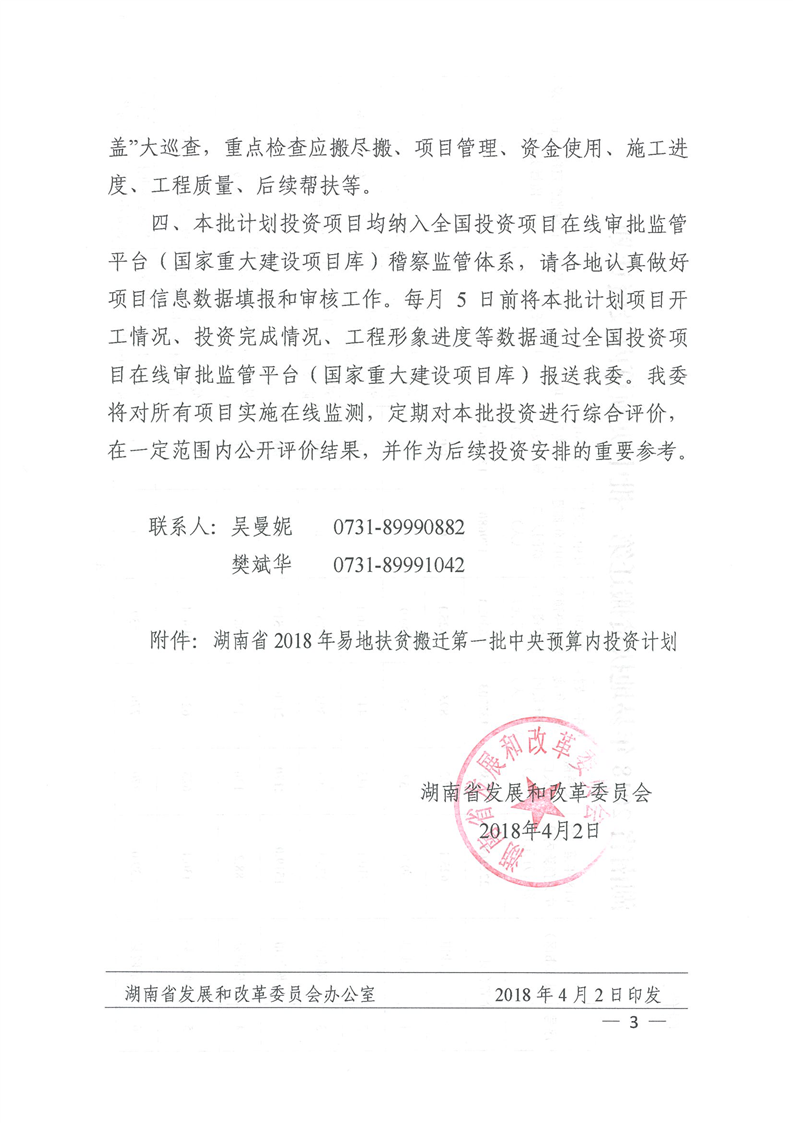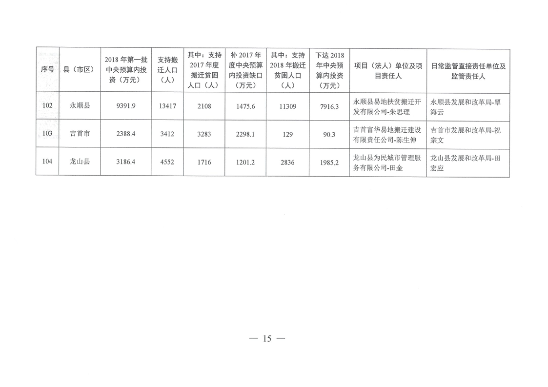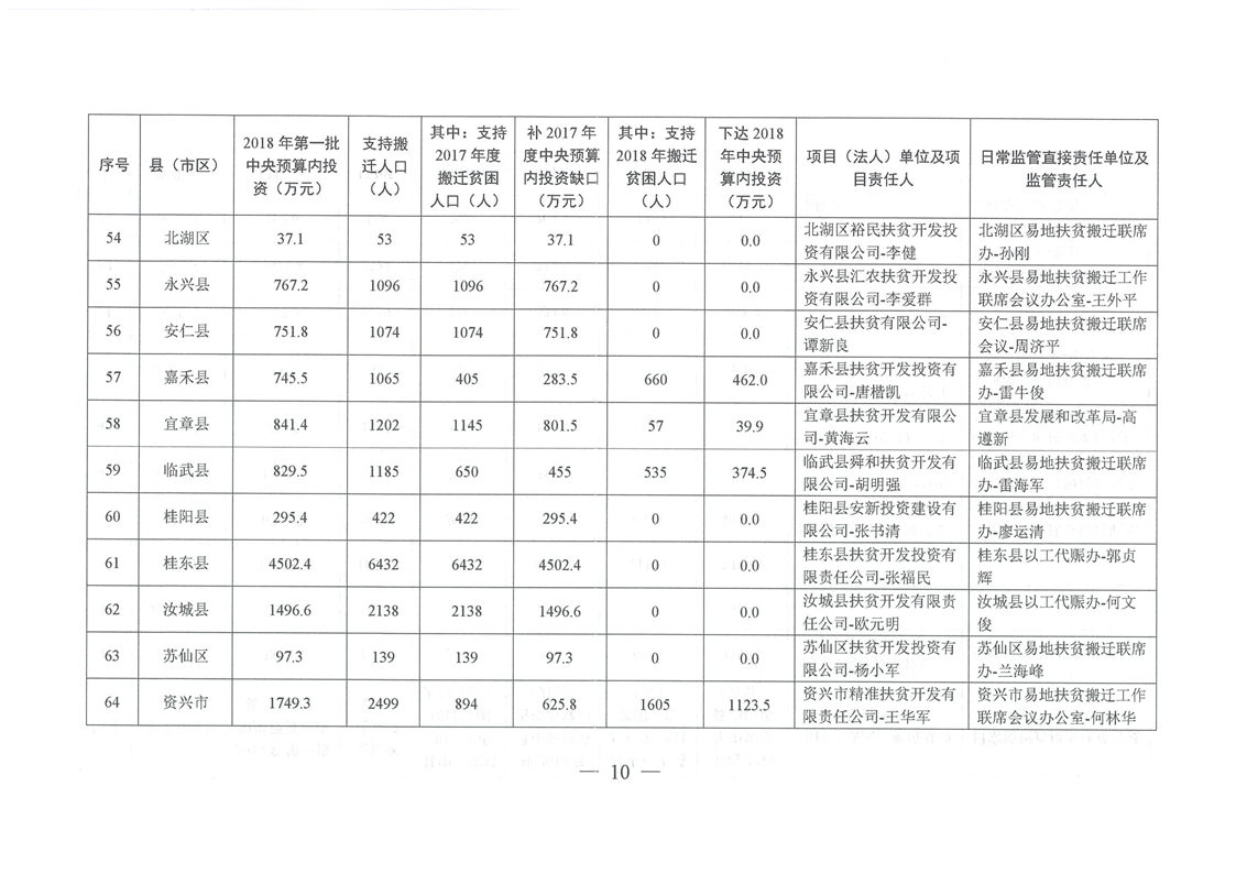湖南省发展和改革委员会关于下达湖南省2018年易地扶贫搬迁工程第一批中央预算内投资计划的通知