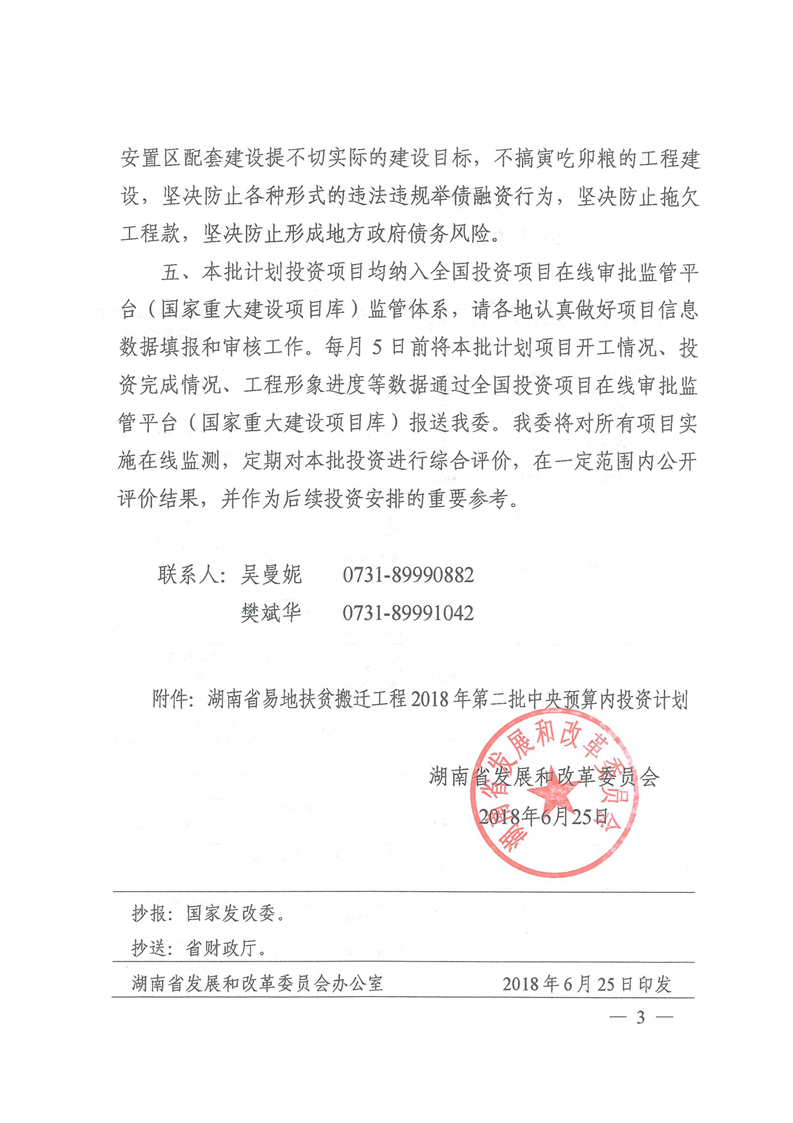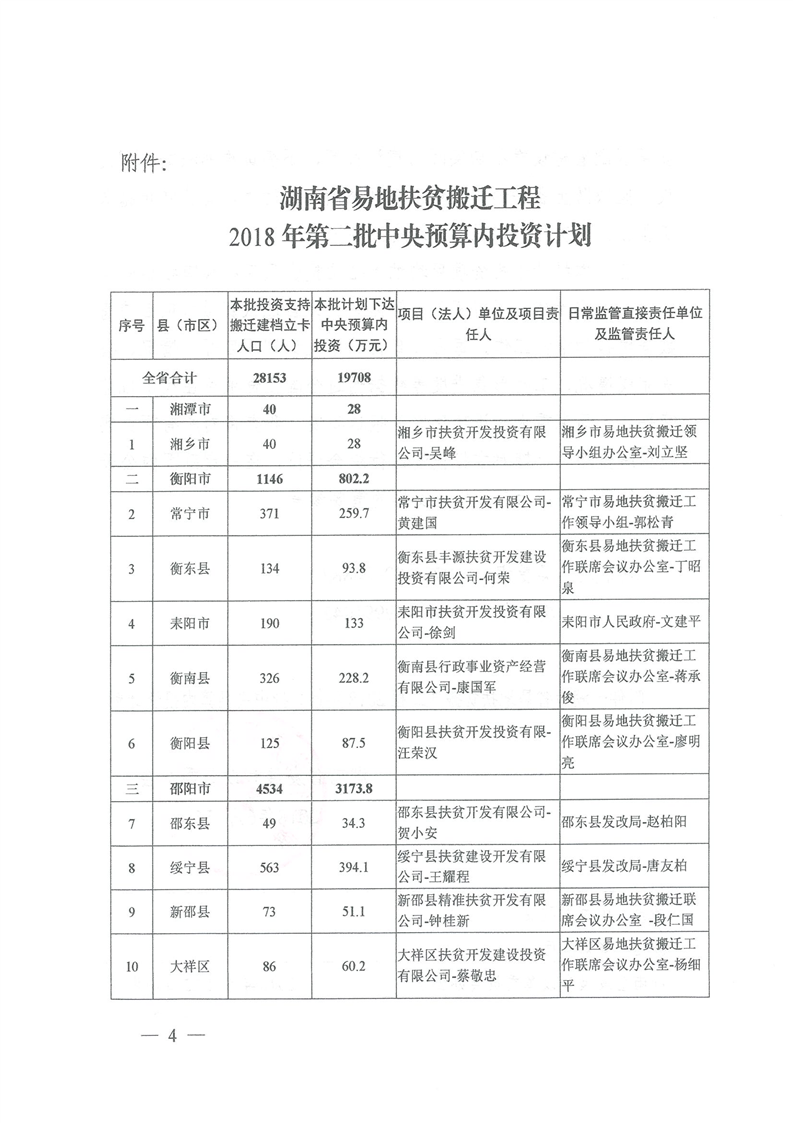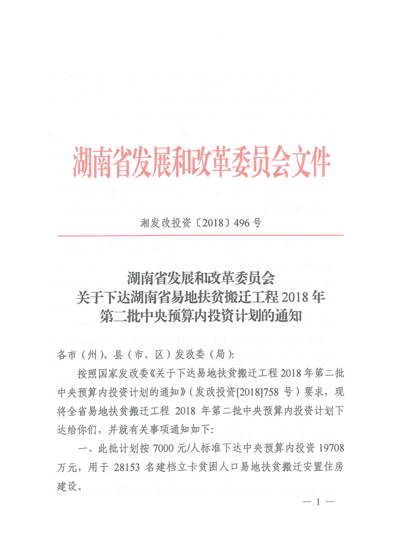 湖南省发展和改革委员会关于下达湖南省易地扶贫搬迁工程2018年第二批中央预算内投资计划的通知