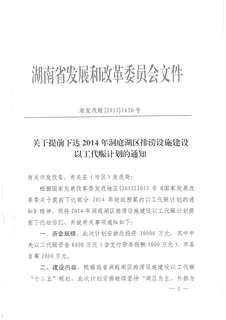 关于提前下达2014年洞庭湖区排涝设施建设以工代赈计划的通知