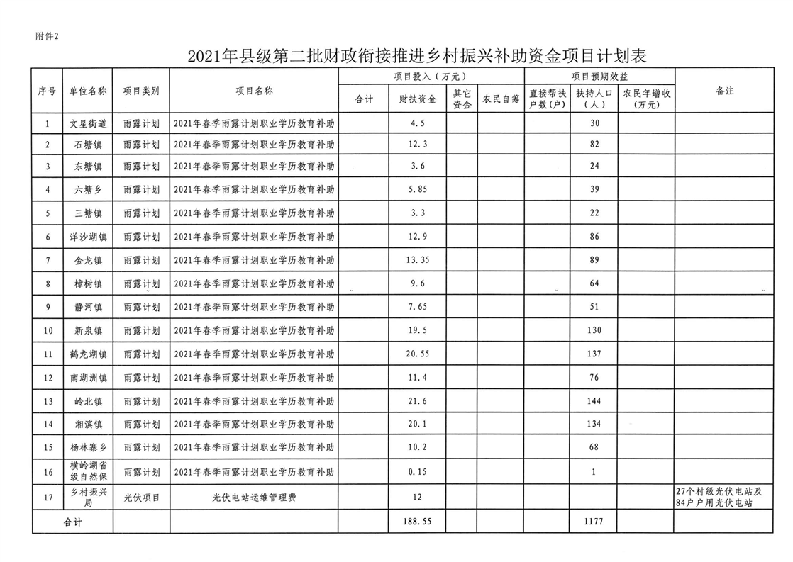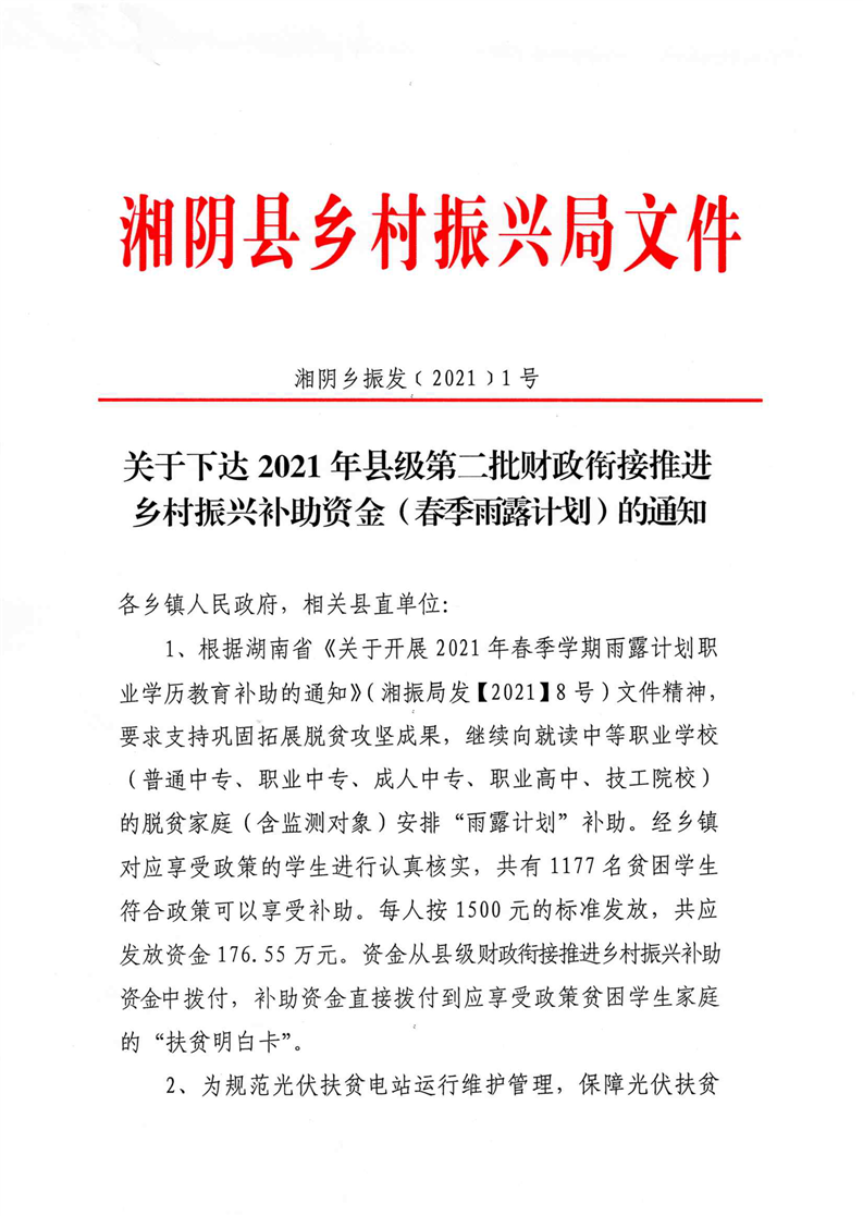 关于下达2021年县级第二批财政衔接推进乡村振兴补助资金(春季雨露计划)的通知