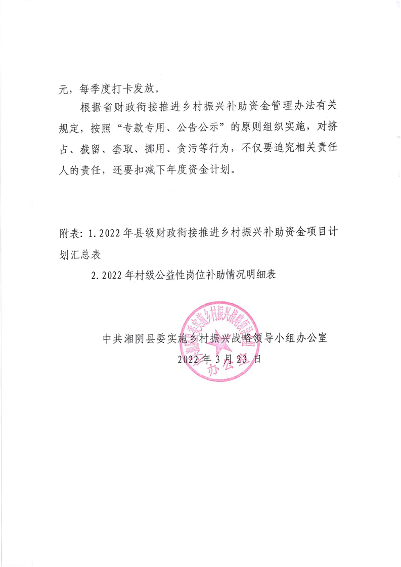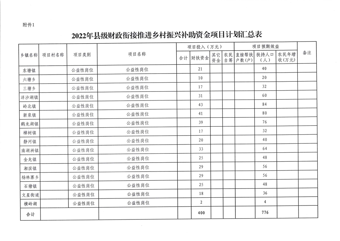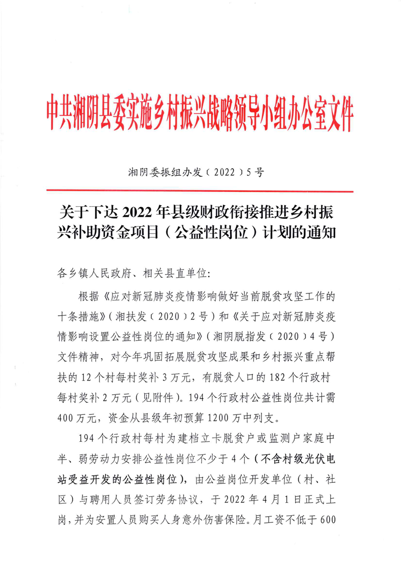 关于下达2022年县级财政衔接推进乡村振兴补助资金项目(公益岗位)计划的通知