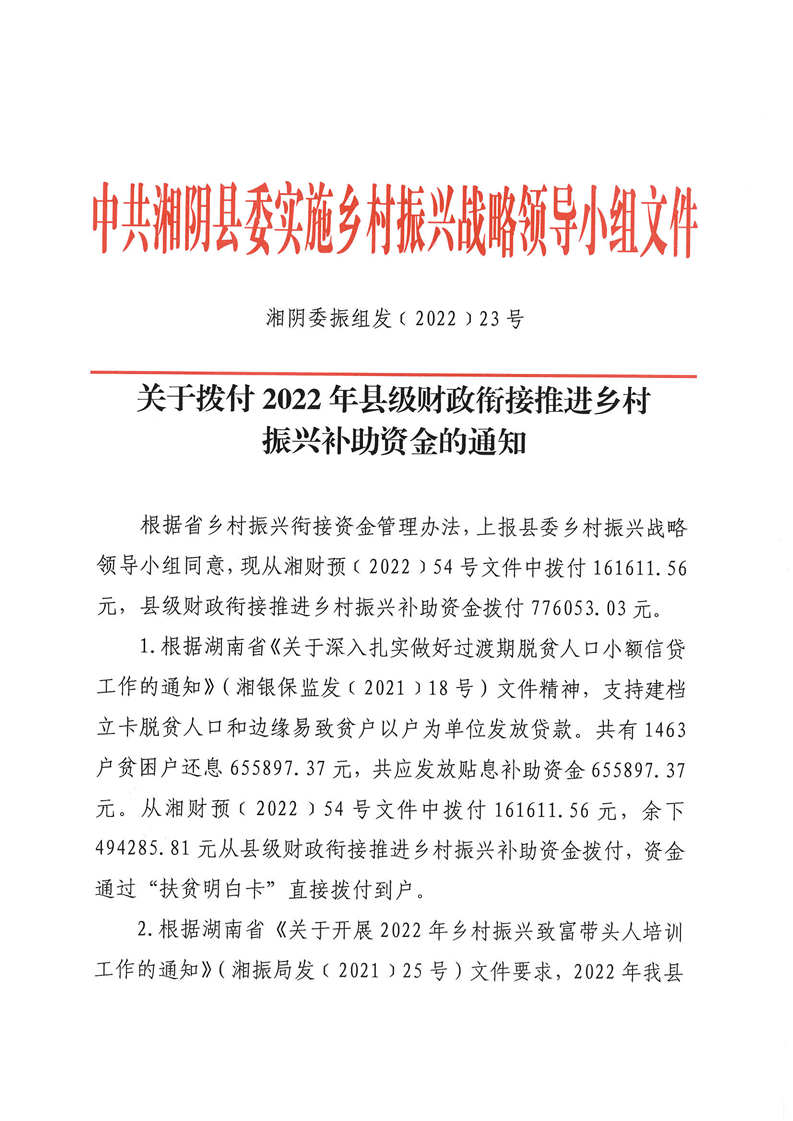 关于拨付2022年县级财政衔接推进乡村振兴补助资金的通知