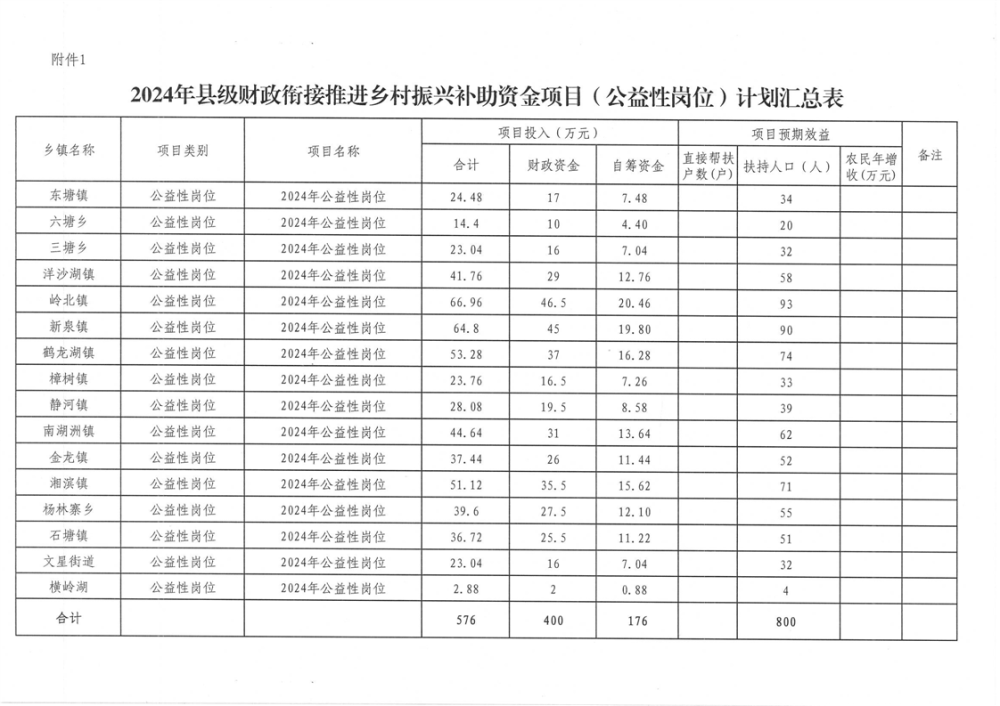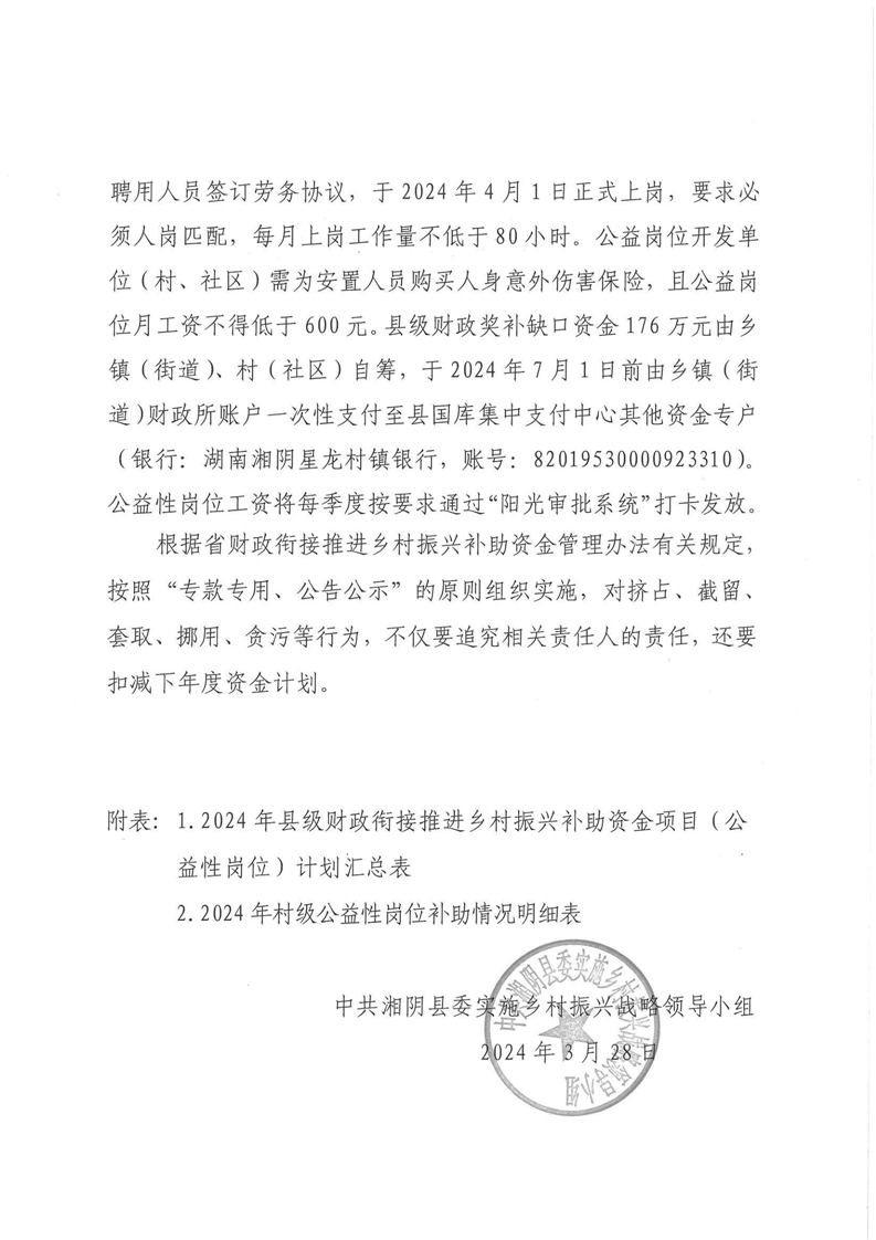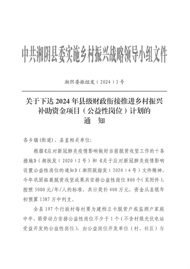 关于下达2024年县级财政衔接推进乡村振兴补助资金项目(公益性岗位)计划的通 知(湘阴委振组发﹝2024﹞3号)
