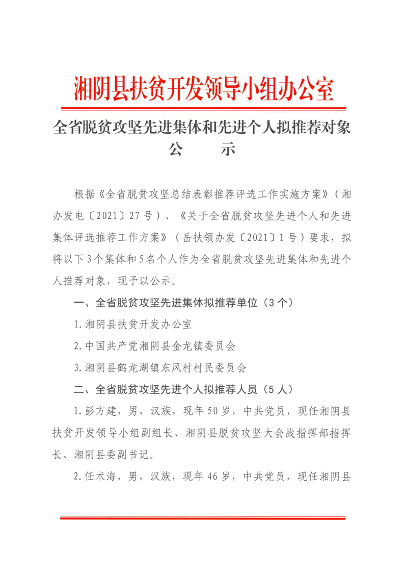 全省脱贫攻坚先进集体和先进个人拟推荐对象公示
