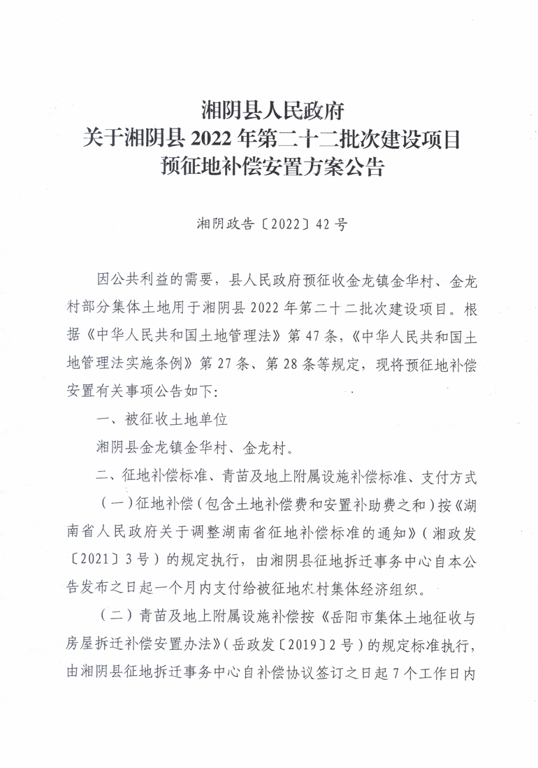 湘阴县人民政府关于湘阴县2022年第二十二批次建设项目预征地补偿安置方案公告