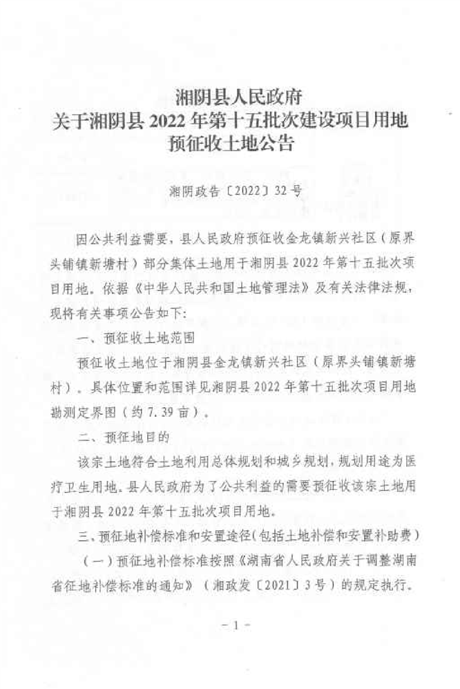 湘阴县人民政府关于湘阴县2022年第十五批次建设项目用地预征收土地公告(湘阴政告【2022】32号)