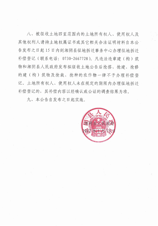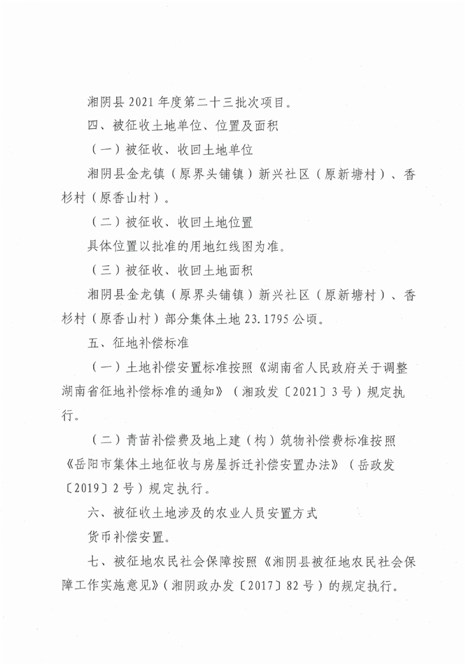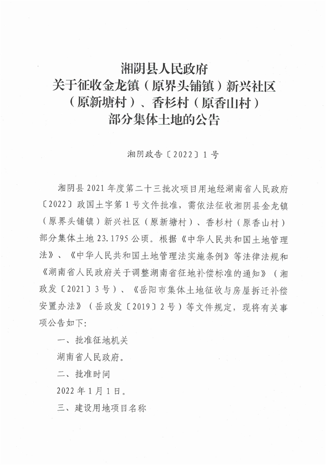 湘阴县人民政府关于征收金龙镇(原界头铺镇)新兴社区(原新塘村)、香杉村(原香山村)部分集体土地的公告(湘阴政告〔2022〕1号)