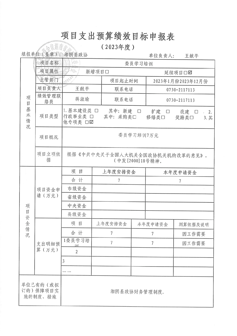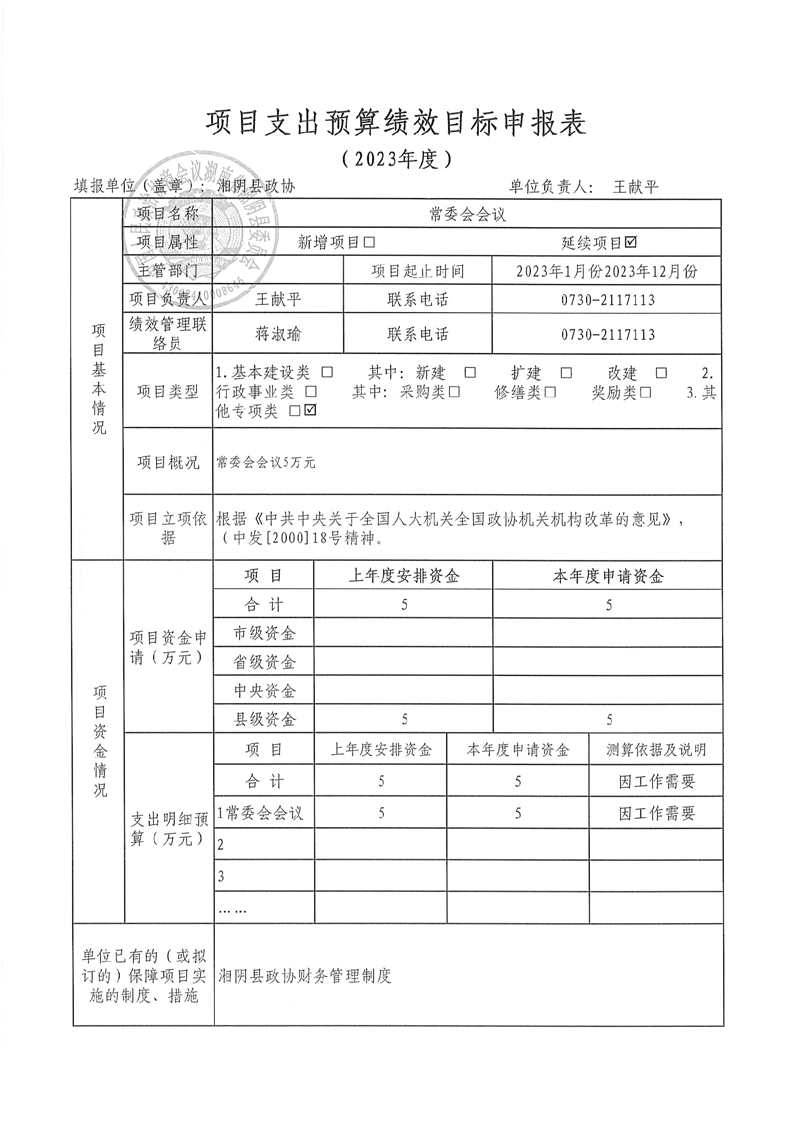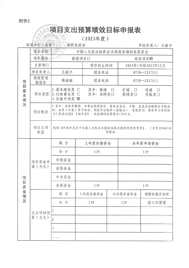 2023年度-湘阴县政协-整体和项目支出预算绩效目标申报表