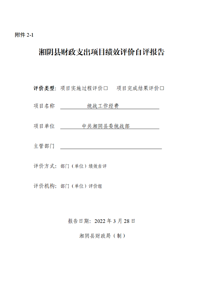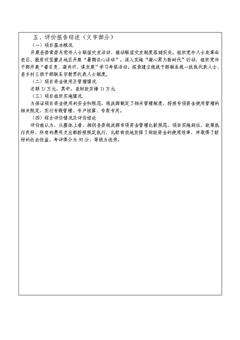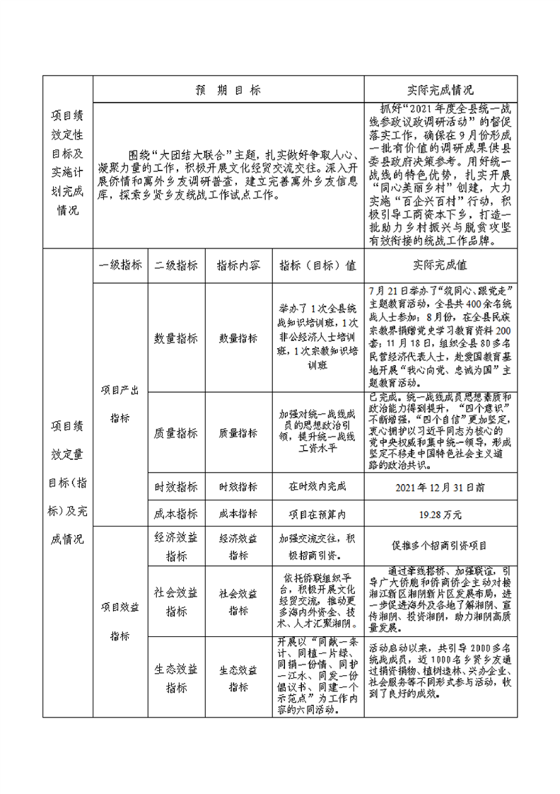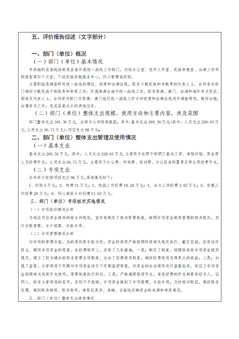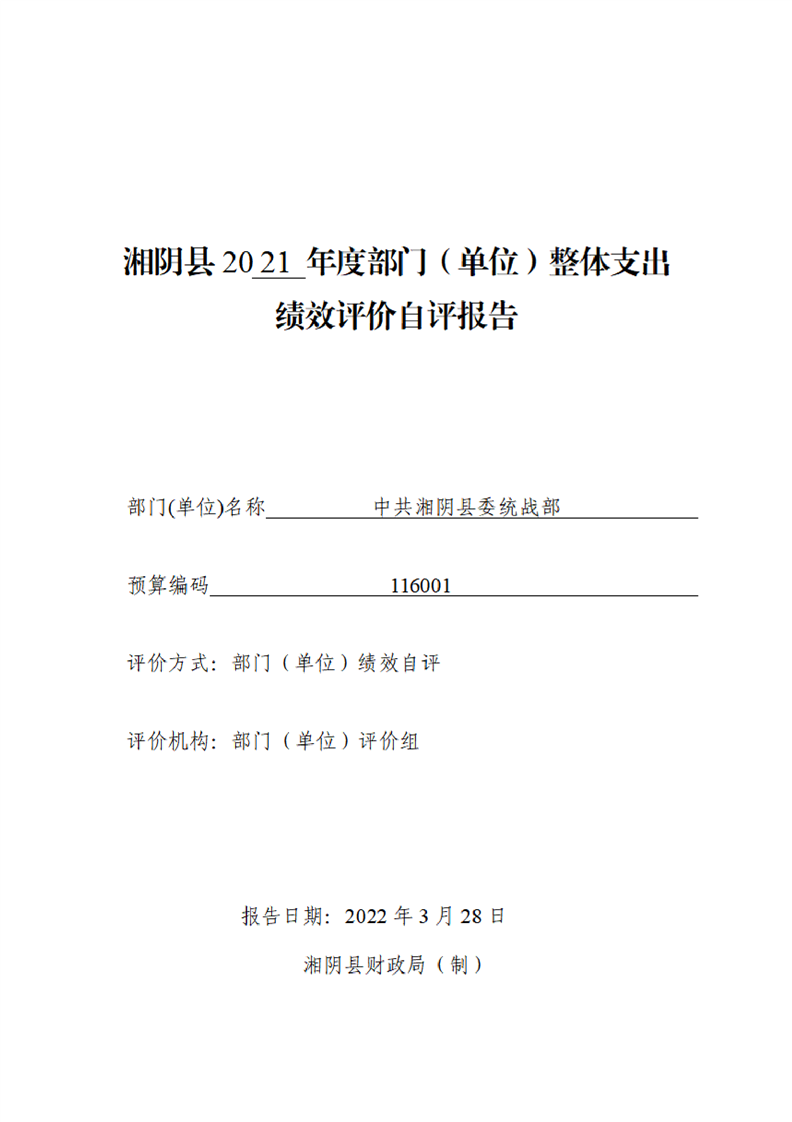 湘阴县统战部2021年度财政支出绩效评价自评 报告