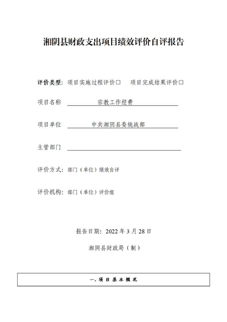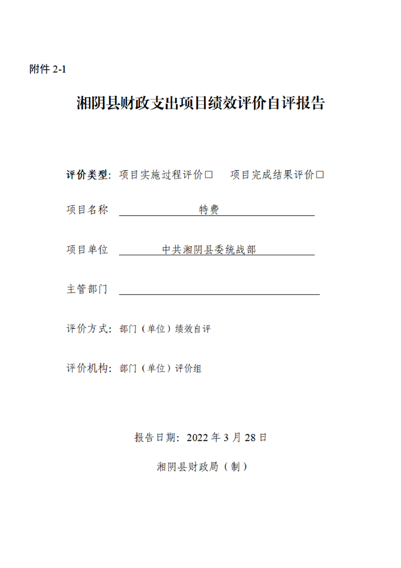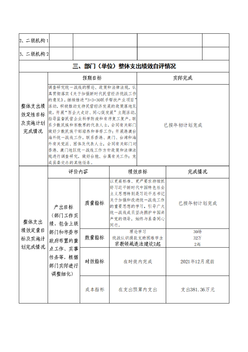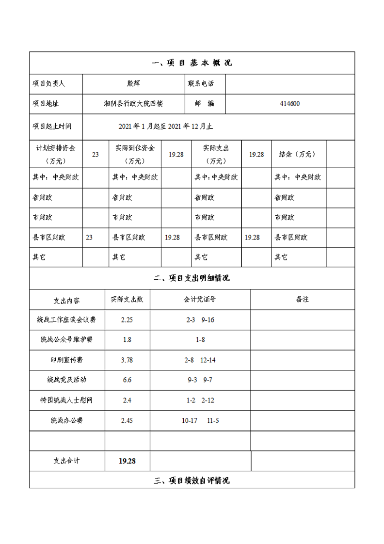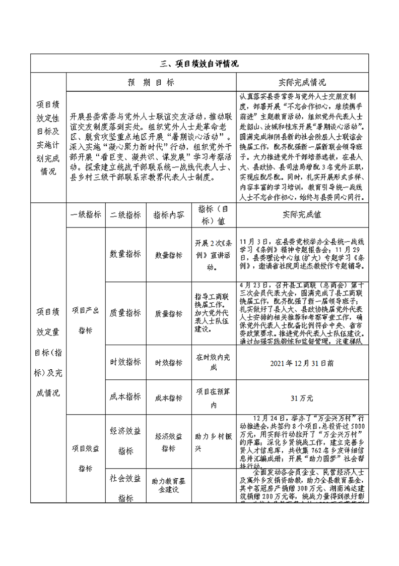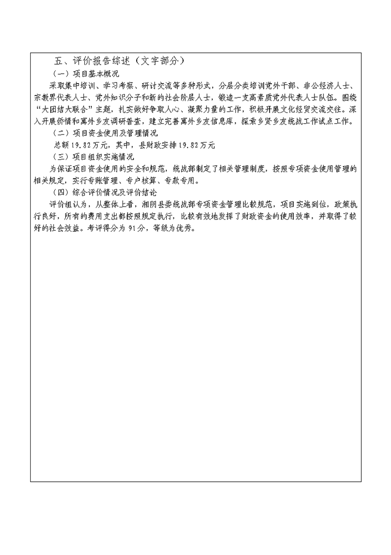 湘阴县统战部2021年度财政支出绩效评价自评 报告