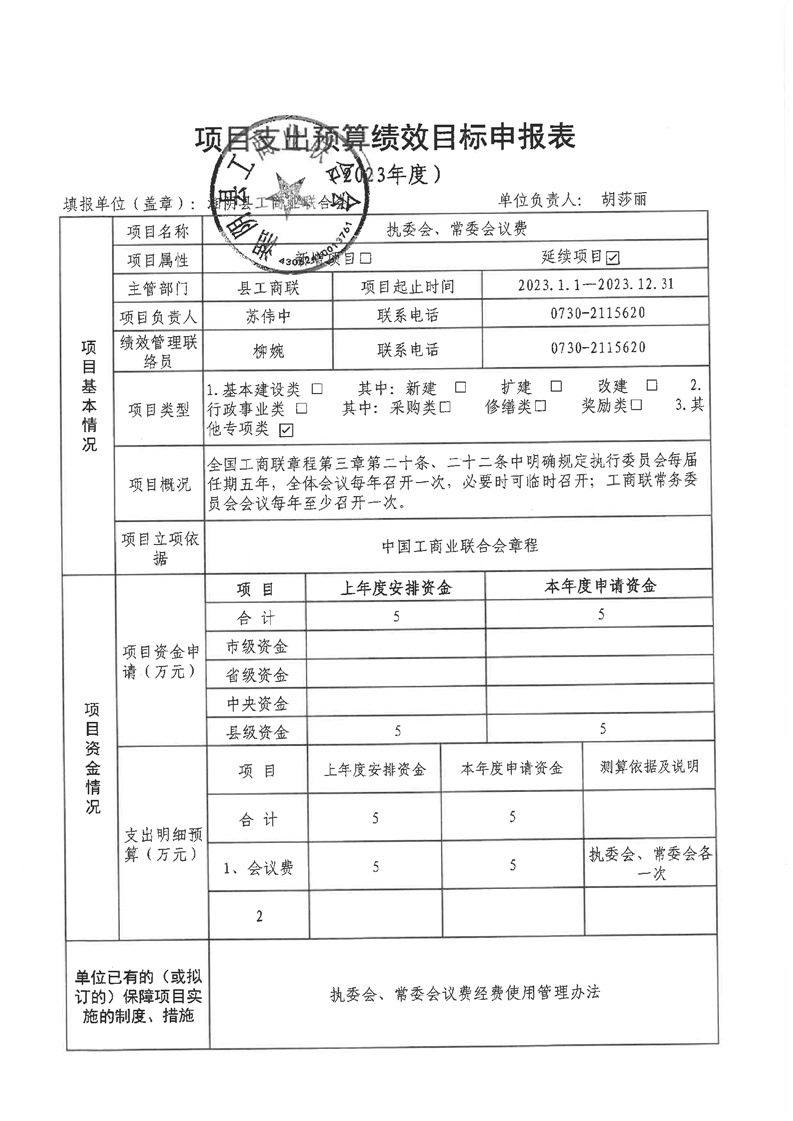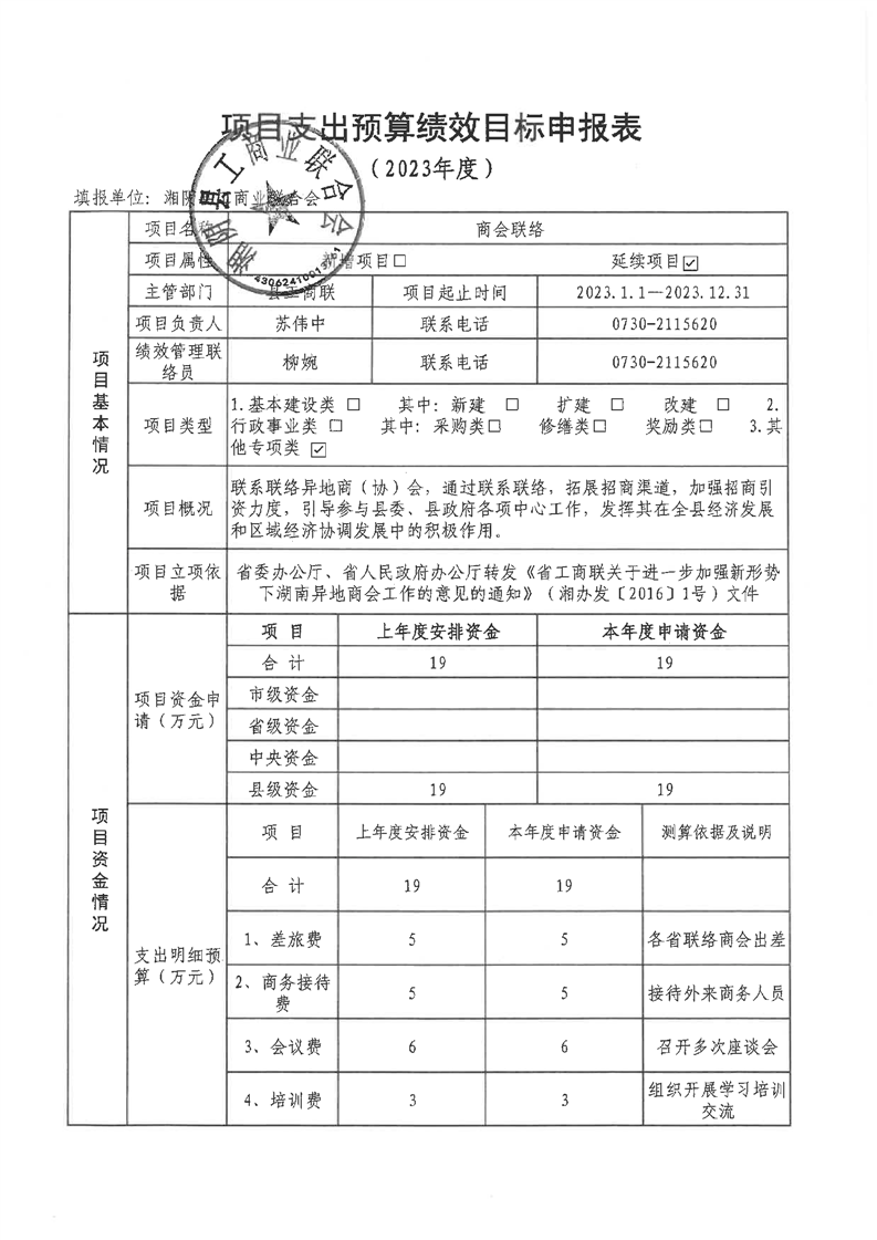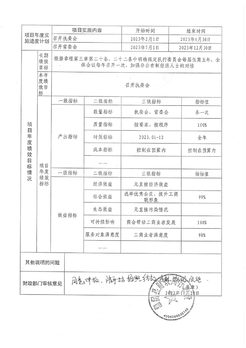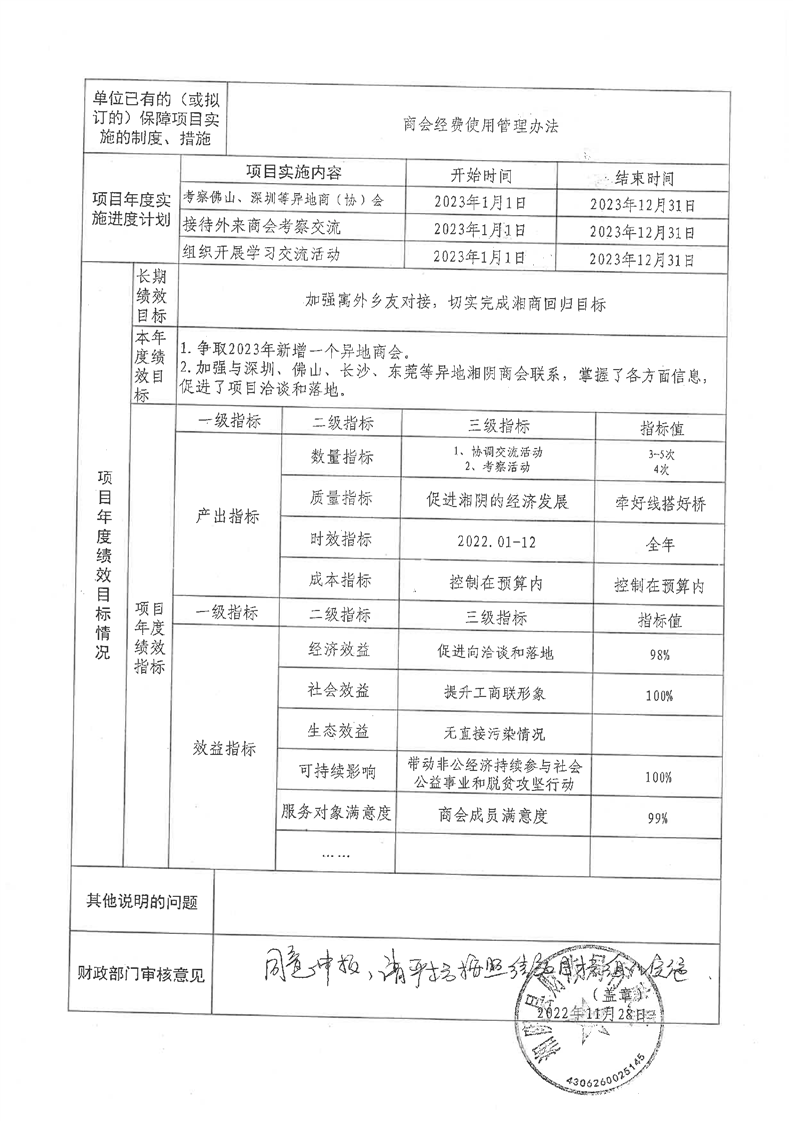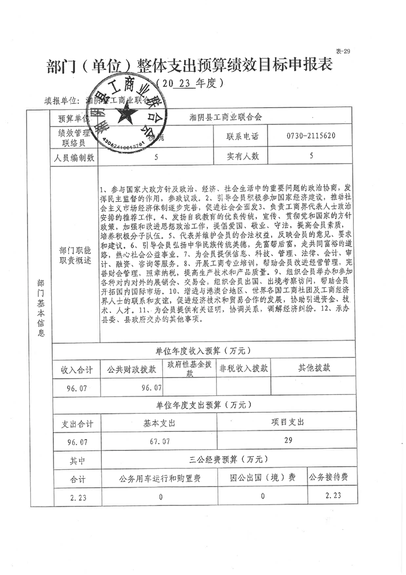 2023年度湘阴县工商联整体支出及项目支出预算绩效目标申报表