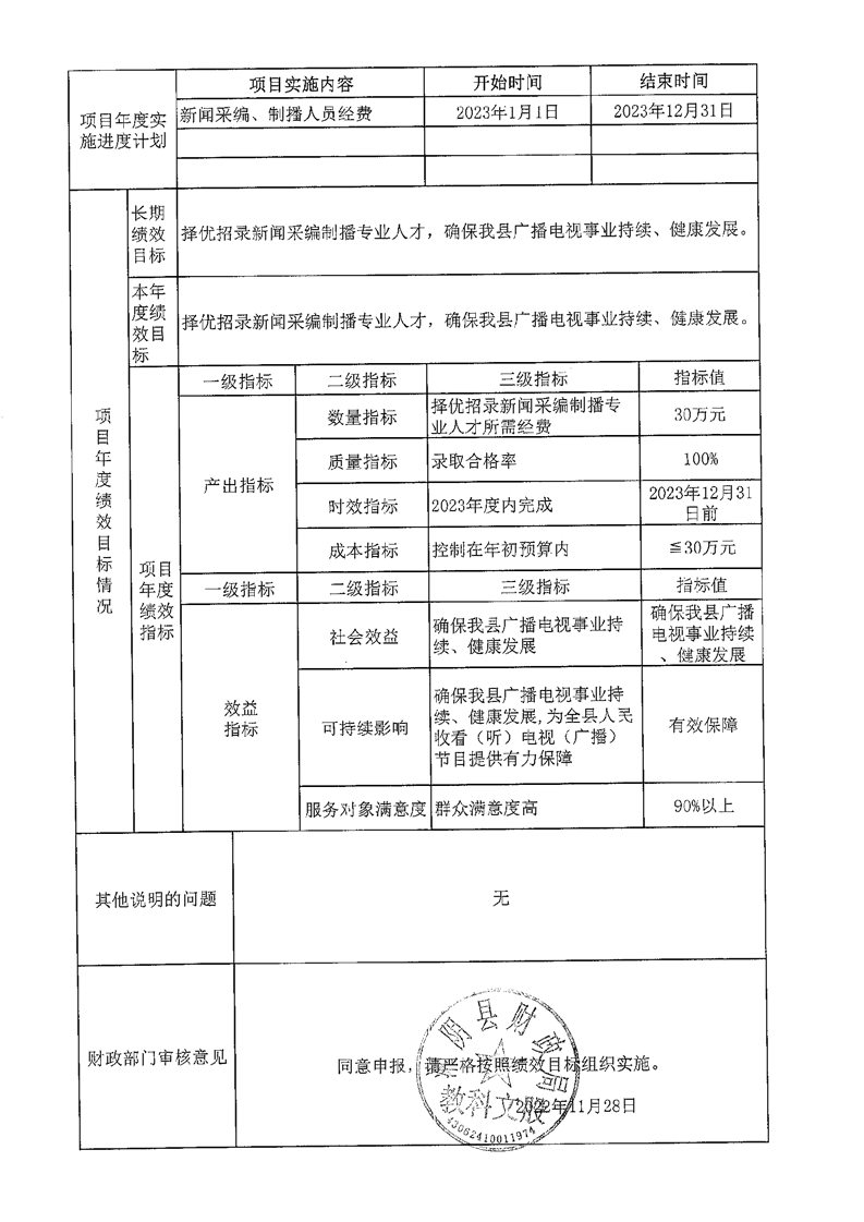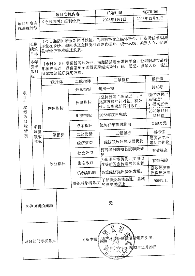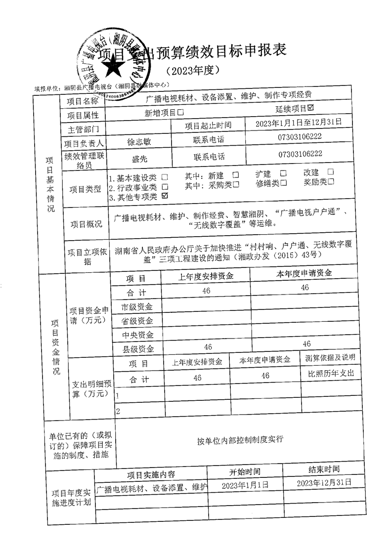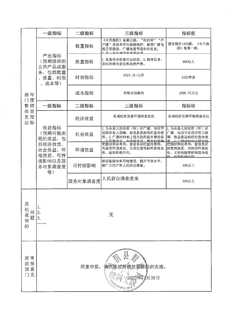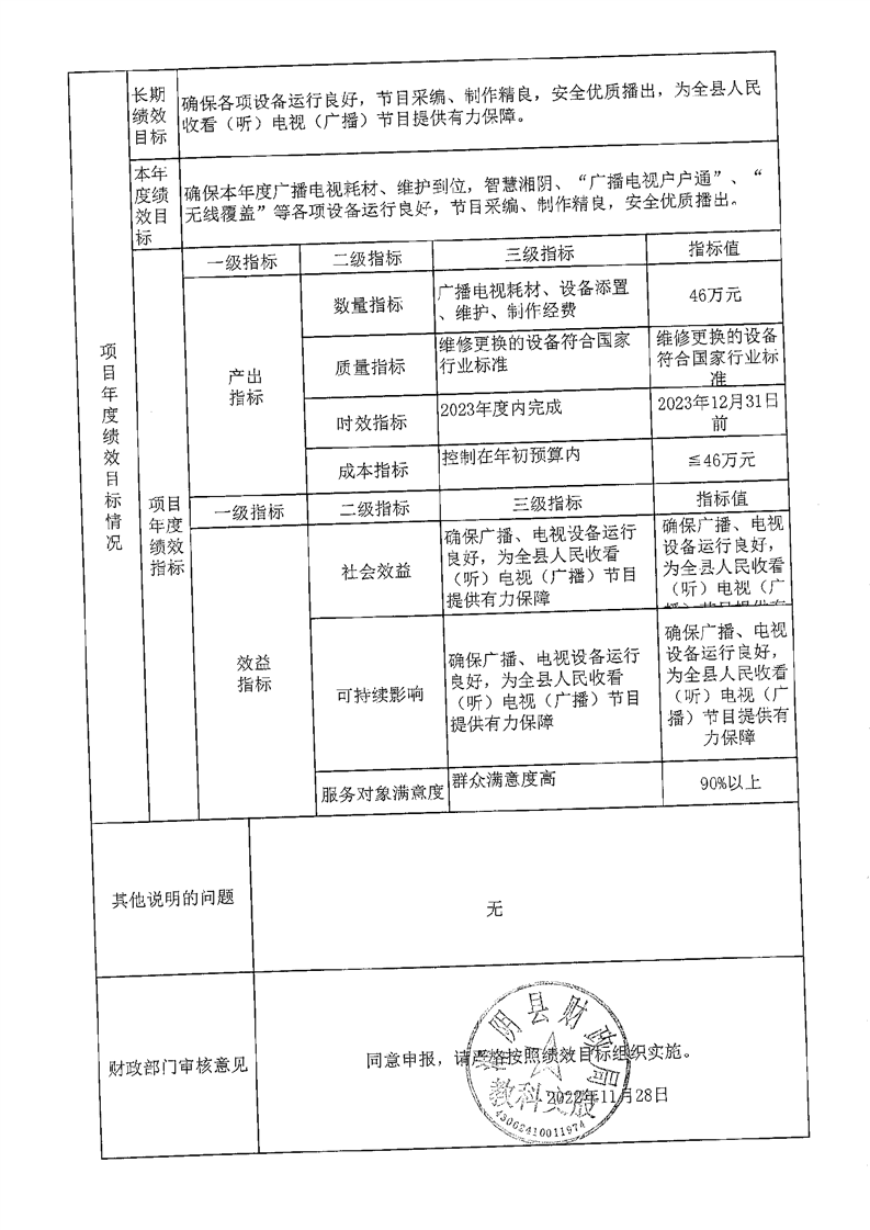 2023年度湘阴县广播电视台整体(专项)预算绩效目标申报表