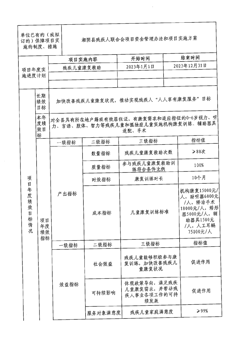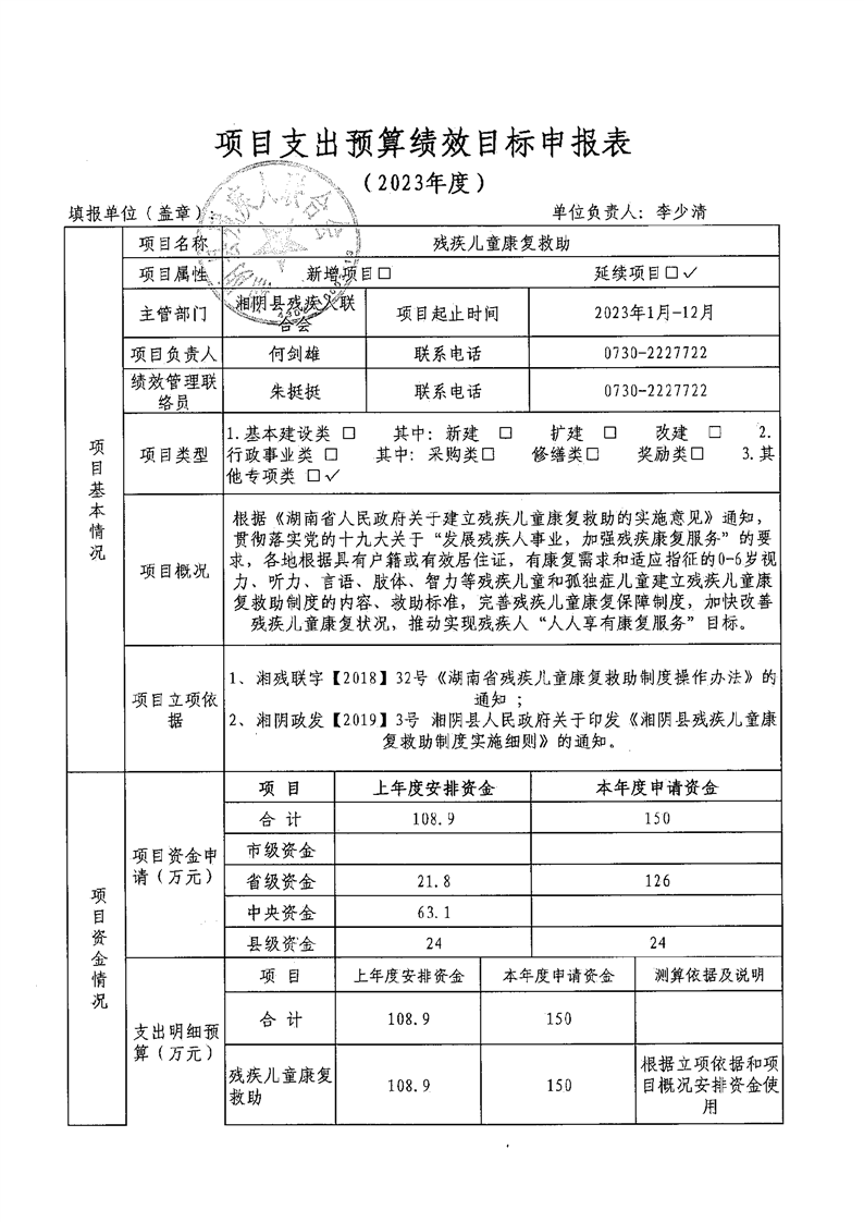 2023年度残疾儿童康复专项支出预算绩效目标申报表