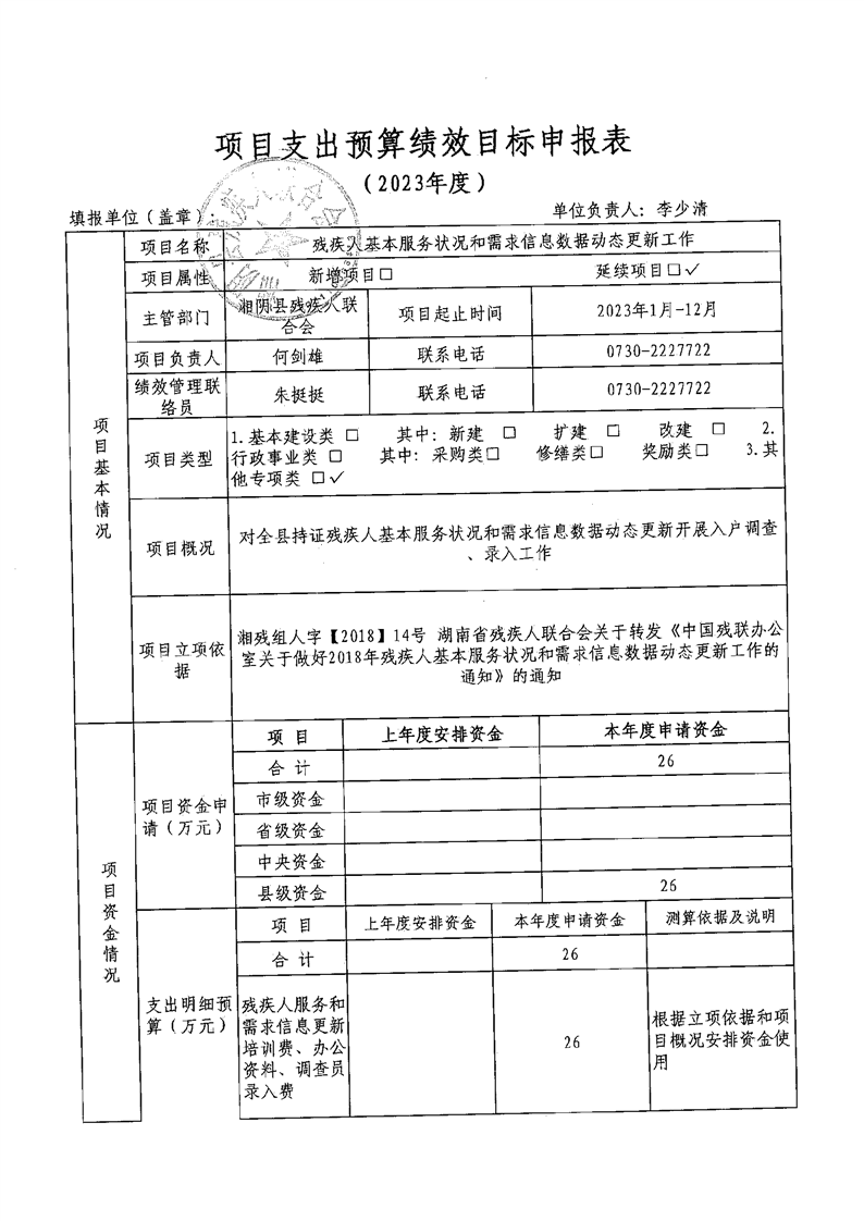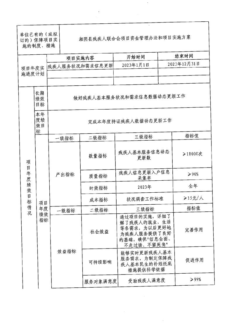 2023年度残疾人基本服务状况和需求信息数据动态更新工作专项支出预算绩效目标申报表