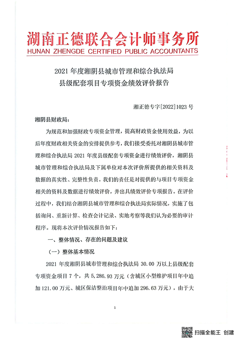 2021年度湘阴县城市管理和综合执法局县级配套项目专项资金绩效评价报告