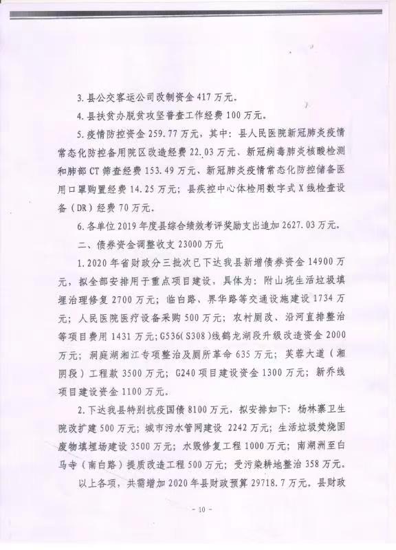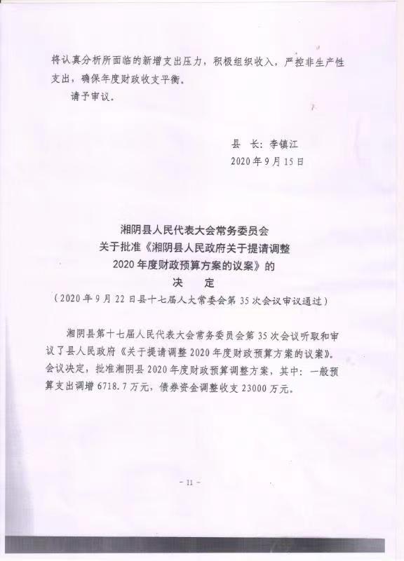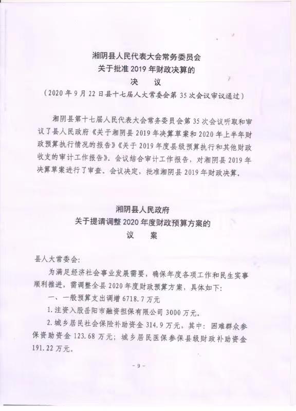 湘阴县人民政府关于提请调整2020年度财政预算方案的议案