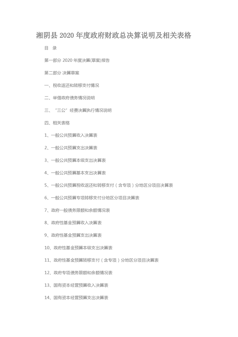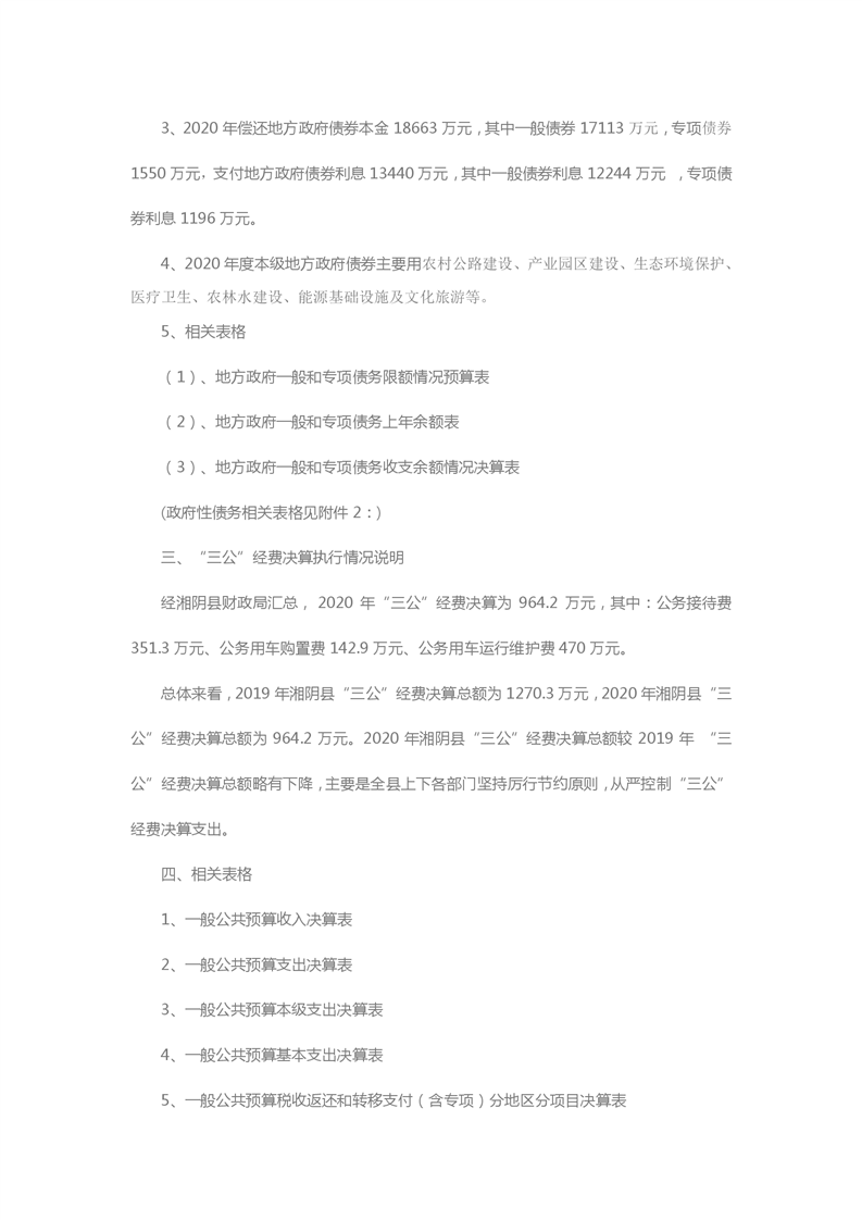 湘阴县2020年度政府财政总决算说明及相关表格