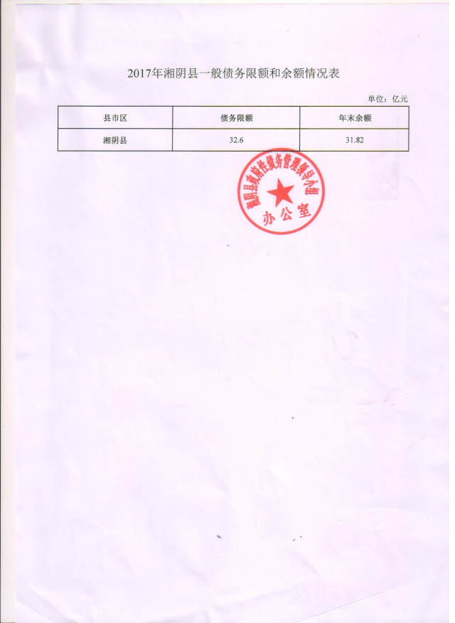 2017年湘阴县一般债务限额和余额情况表