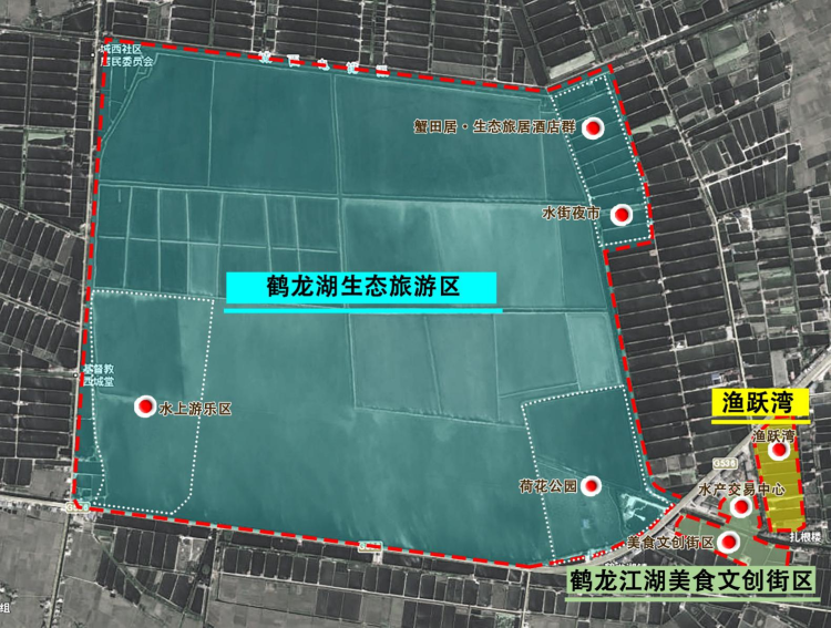 两区--精品生态旅游区:打造集大湖农渔休闲、田园拓展训练、蟹虾美食体验、精品主题住宿等功能于一体的精品休闲旅游区域。