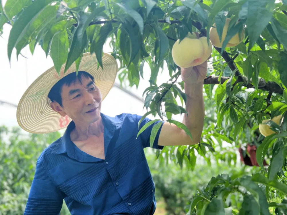 ▲蟠桃成熟上市,丰寿正在园内采摘。梁焕鑫摄