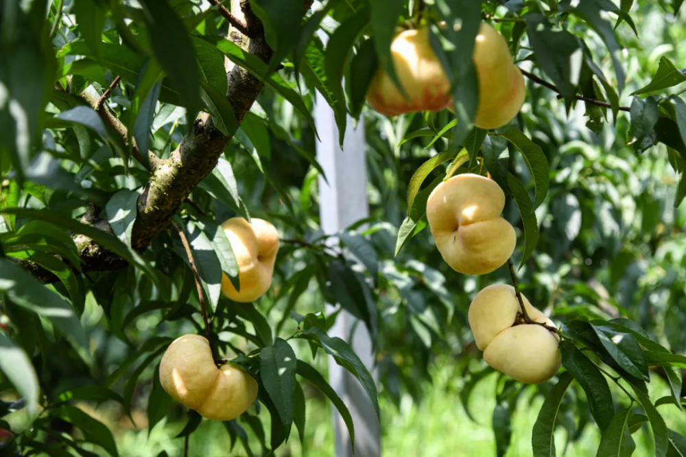 ▲挂满枝头的蟠桃金黄透亮,引得游客垂涎欲滴。刘慧 摄