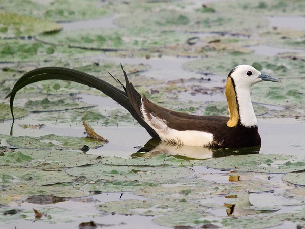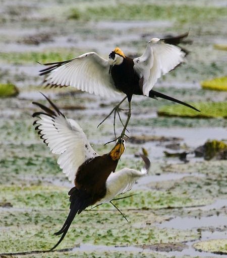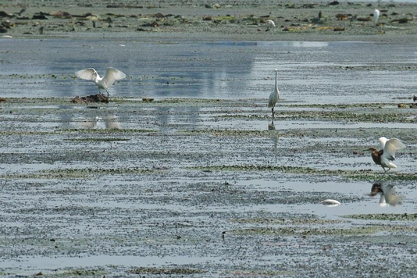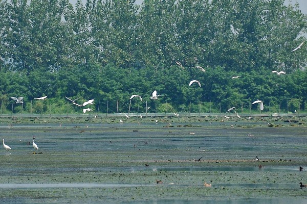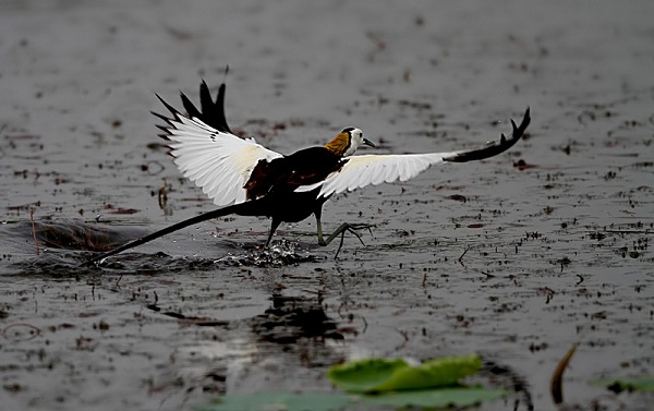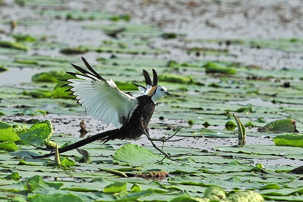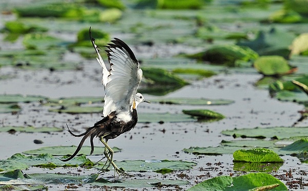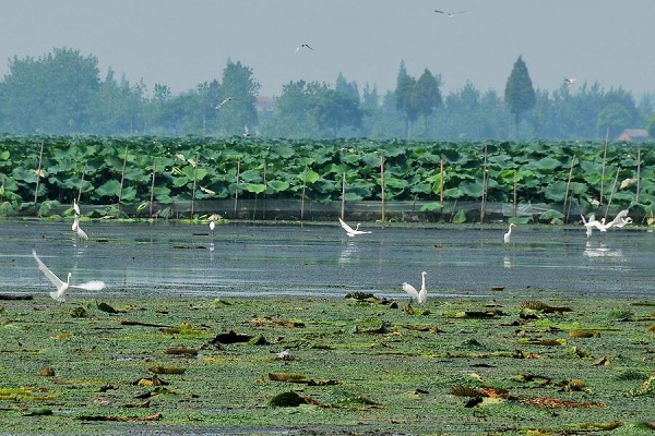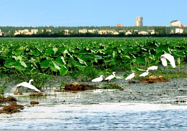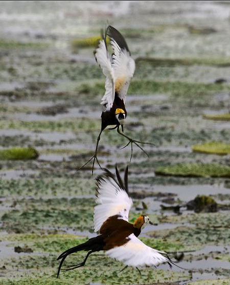 鹤龙湖区有水雉、白鹭、苍鹭、青脚鹬等50多种鸟类生活,在冬季候鸟迁徙高峰期,这里鸟的总量可达30多万只。草长平湖白鹭飞,是摄影爱好者的圣地。在湘阴县鹤龙湖荷花公园,两只水雉在种植着万亩荷花的湖面嬉戏。水雉是一种夏候鸟,大脚趾、大过身。而体重不到半斤,因此可以稳稳地轻步行走在荷花、菱角、芡实等浮叶植物上,被不少鸟类专家称为淡水湿地上姿态最优美的鸟,有着“凌波仙子”、“水中凤凰”等美名。这种水鸟对生态环境的要求极高,目前已属于濒危鸟种,在我国的数量已非常稀少。