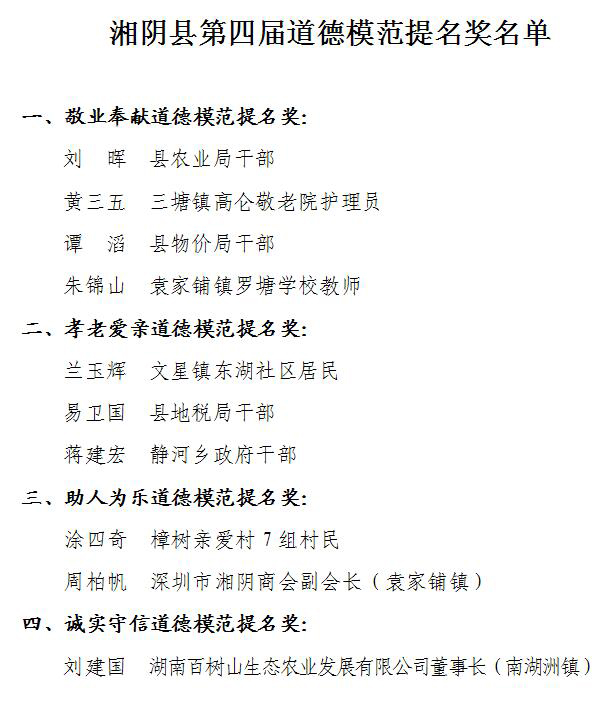 自2009年以来,我县每两年组织评选一届道德模范,产生了强烈社会反响。从今年初起,我县以“寻找身边好人”为载体,在全县范围内开展了第四届道德模范评选活动。经过层层推荐、组织审核、征求意见、组织考察、综合评定、媒体公示等评选程序,42名候选先进人物中,有10位荣获“湘阴县第四届道德模范”,10位荣获“湘阴县第四届道德模范提名奖”。