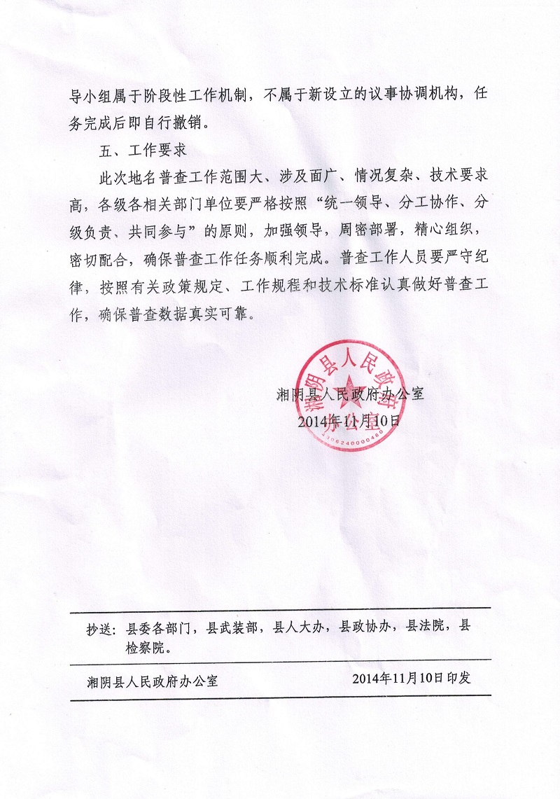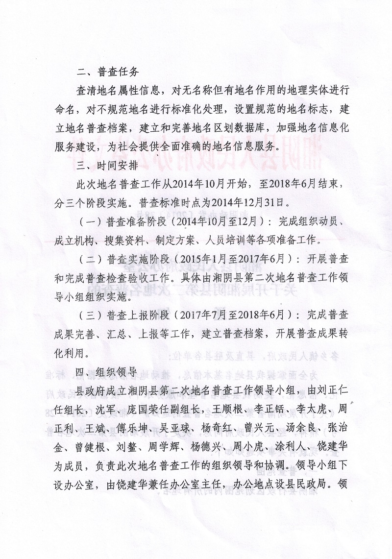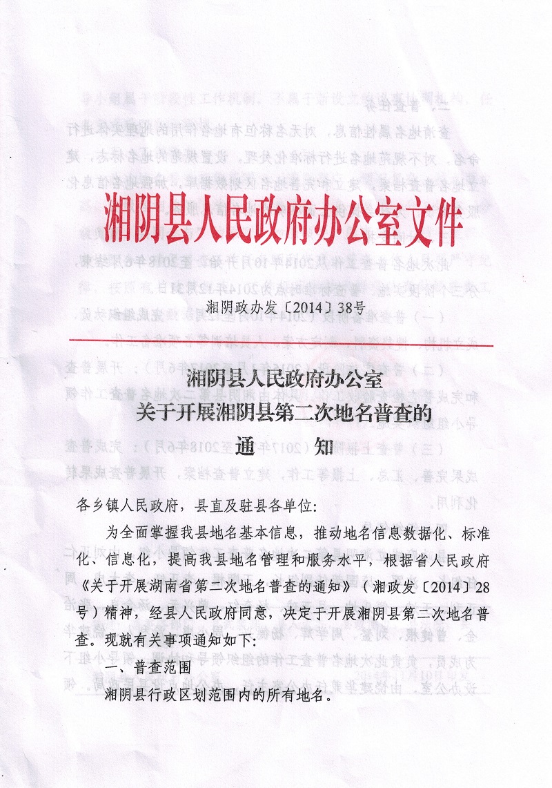 湘阴县人民政府办公室关于开展湘阴县第二次地名普查的通知