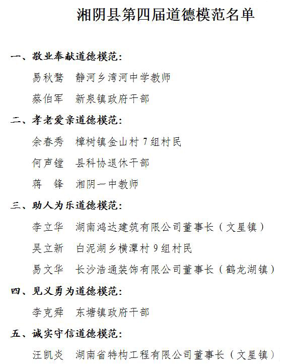 自2009年以来,我县每两年组织评选一届道德模范,产生了强烈社会反响。从今年初起,我县以“寻找身边好人”为载体,在全县范围内开展了第四届道德模范评选活动。经过层层推荐、组织审核、征求意见、组织考察、综合评定、媒体公示等评选程序,42名候选先进人物中,有10位荣获“湘阴县第四届道德模范”,10位荣获“湘阴县第四届道德模范提名奖”。