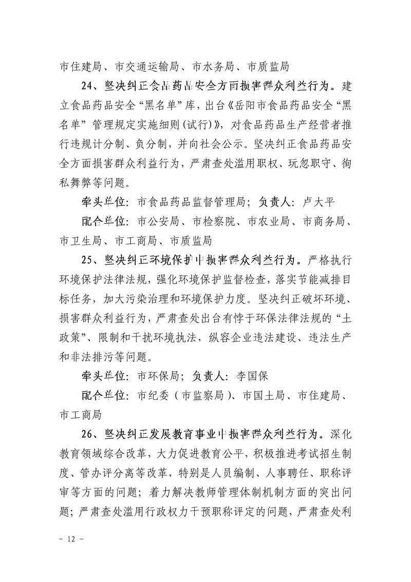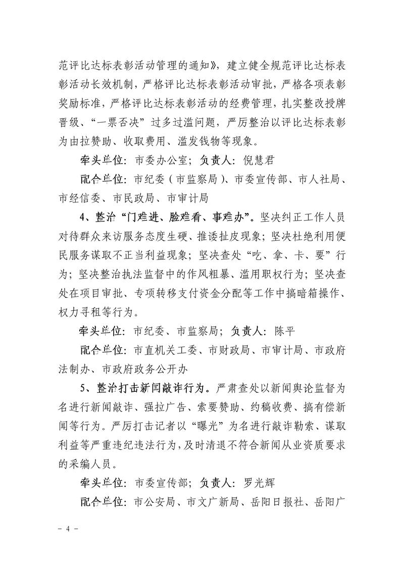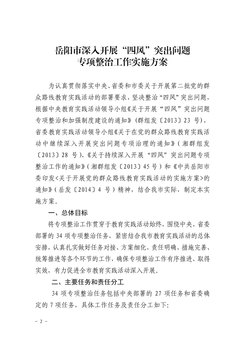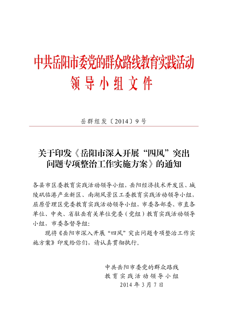关于印发《岳阳市深入开展“四风”突出问题专项整治工作实施方案》的通知