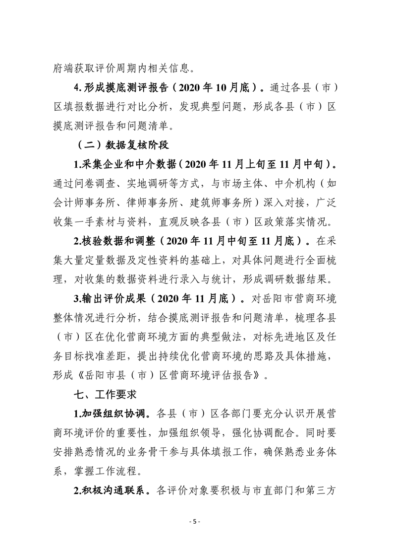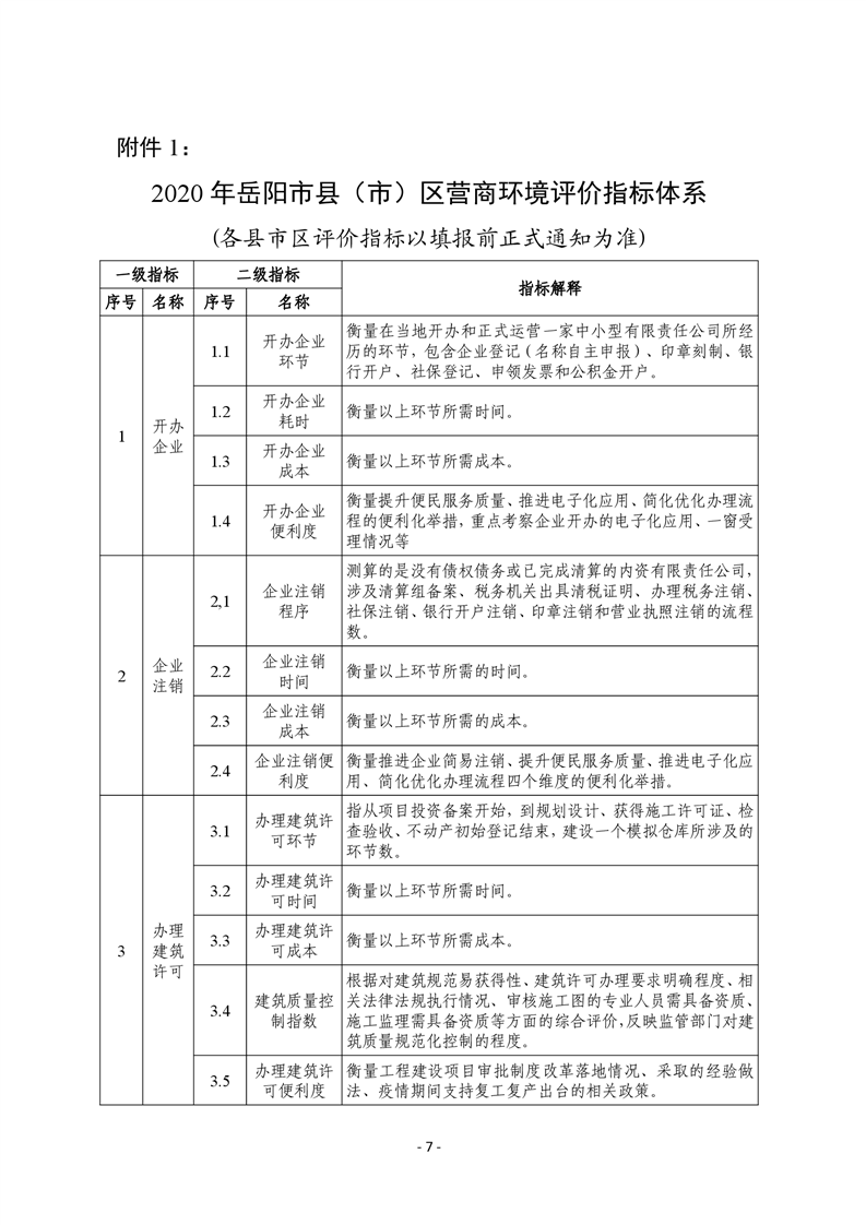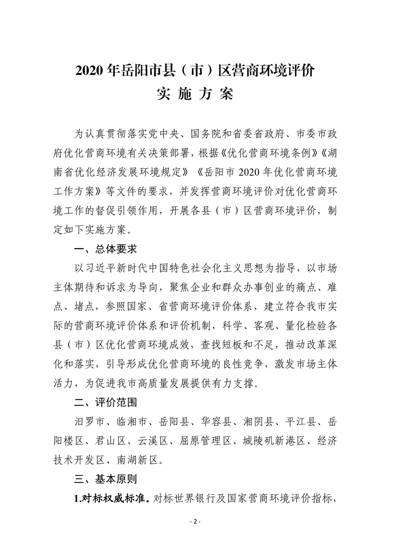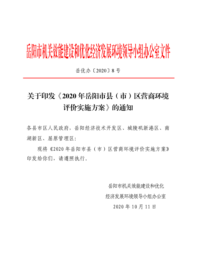 关于印发《2020年岳阳市县(市)区营商环境评价实施方案》的通知