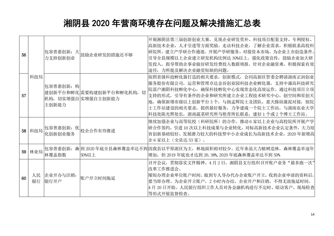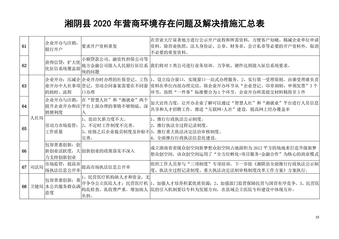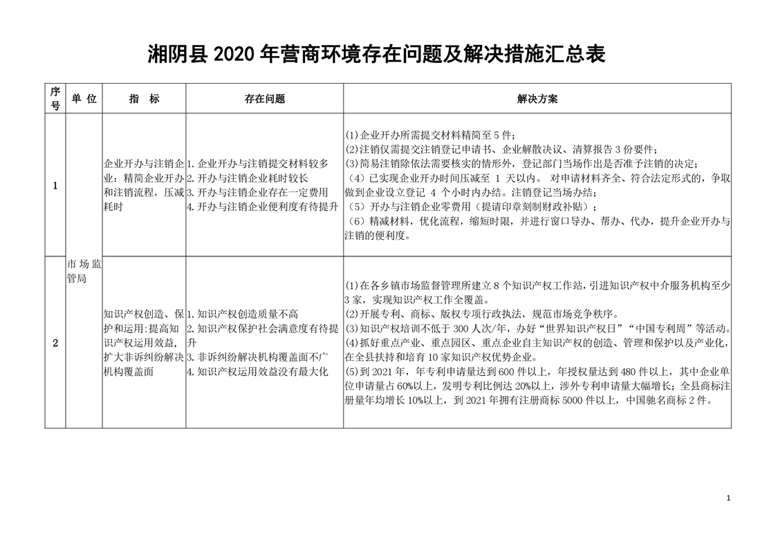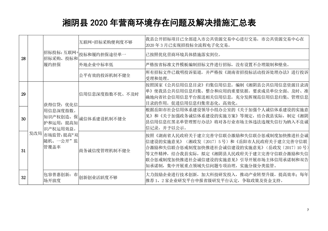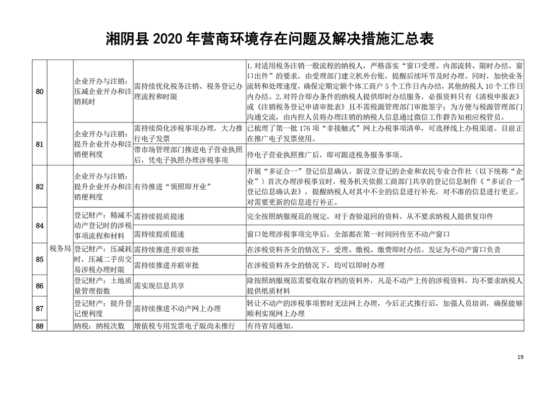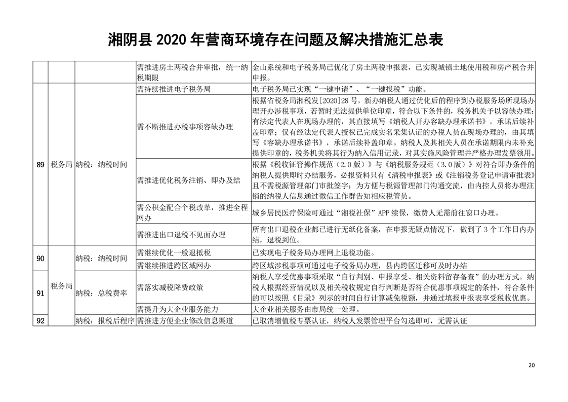 关于印发《湘阴县进一步优化营商环境任务分解表》《湘阴县2020年营商环境存在的问题及解决措施汇总表》《湘阴县部门单位营商环境评价指标责任单位和责任人汇总表》的通知