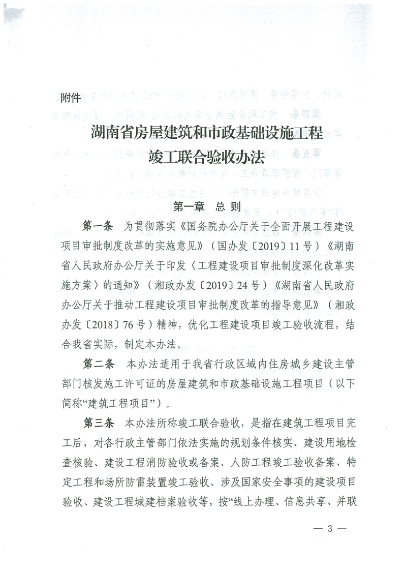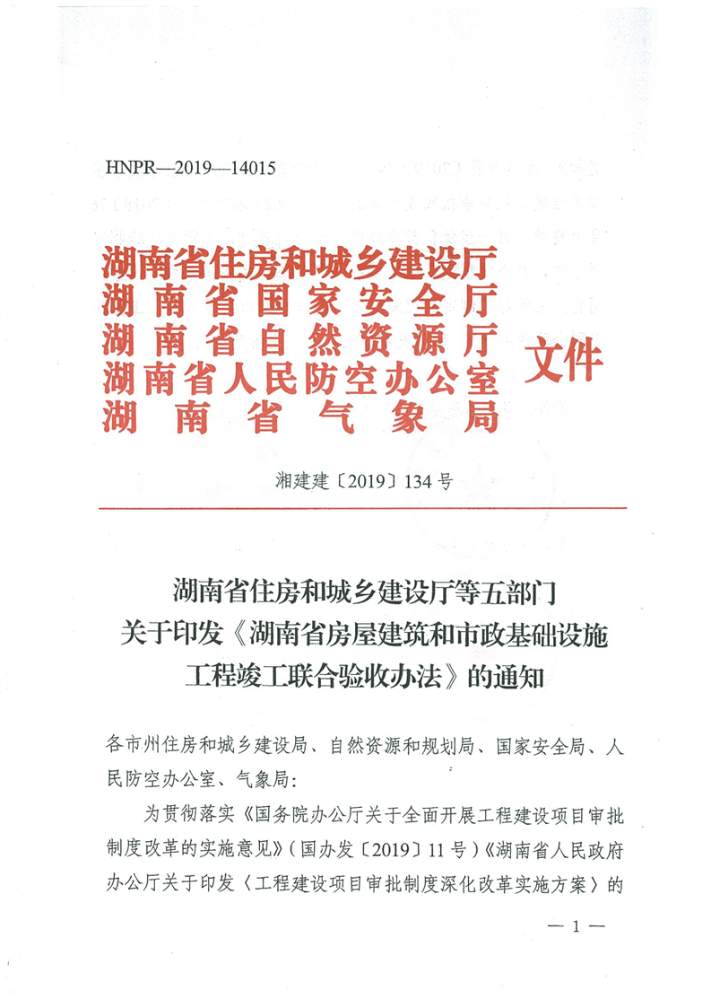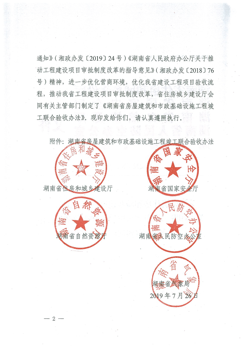 湖南省住房和城乡建设厅等五部门关于印发《湖南省房屋建筑和市政基础设施工程竣工联合验收办法》的通知(湘建建〔2019〕134号)