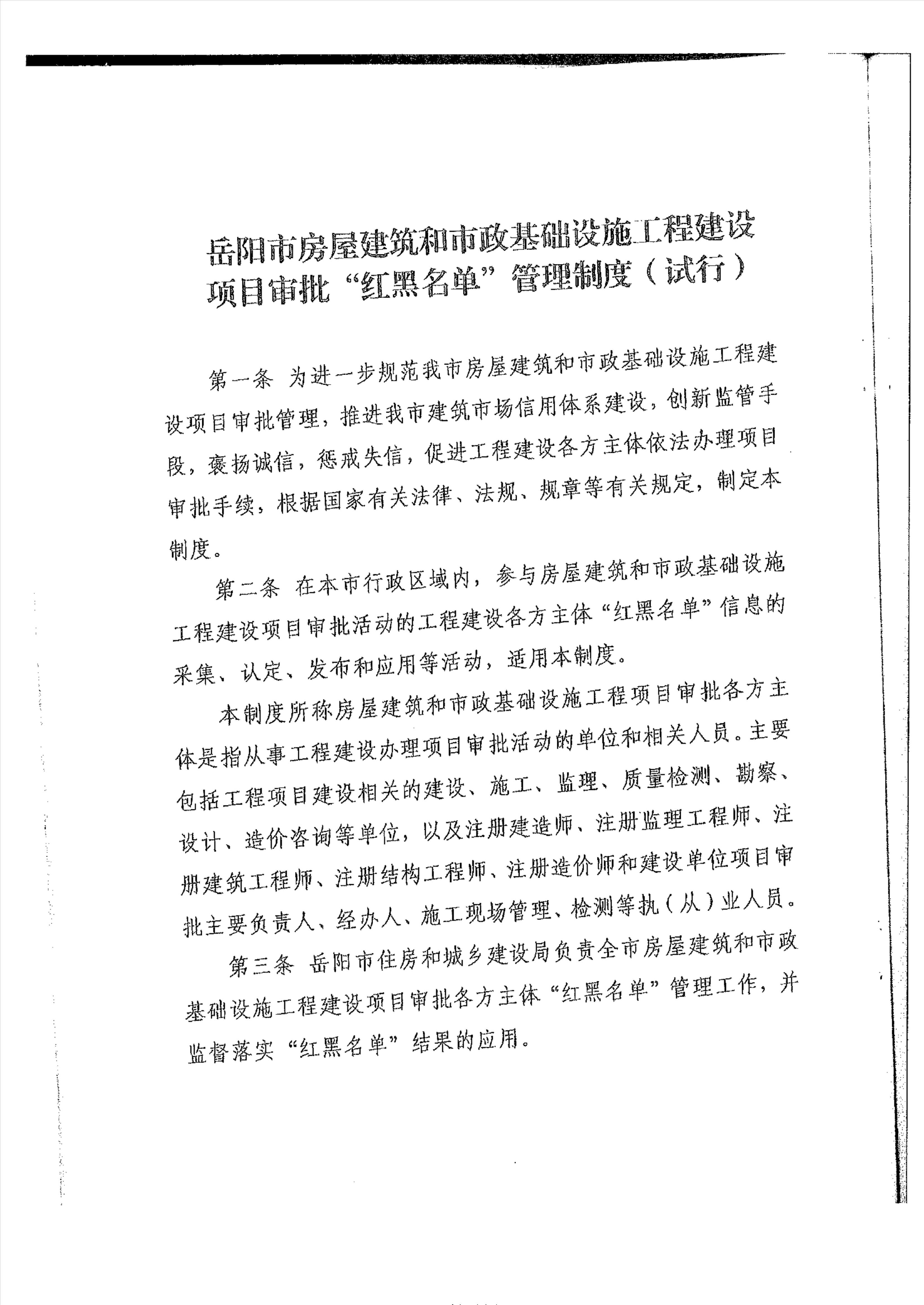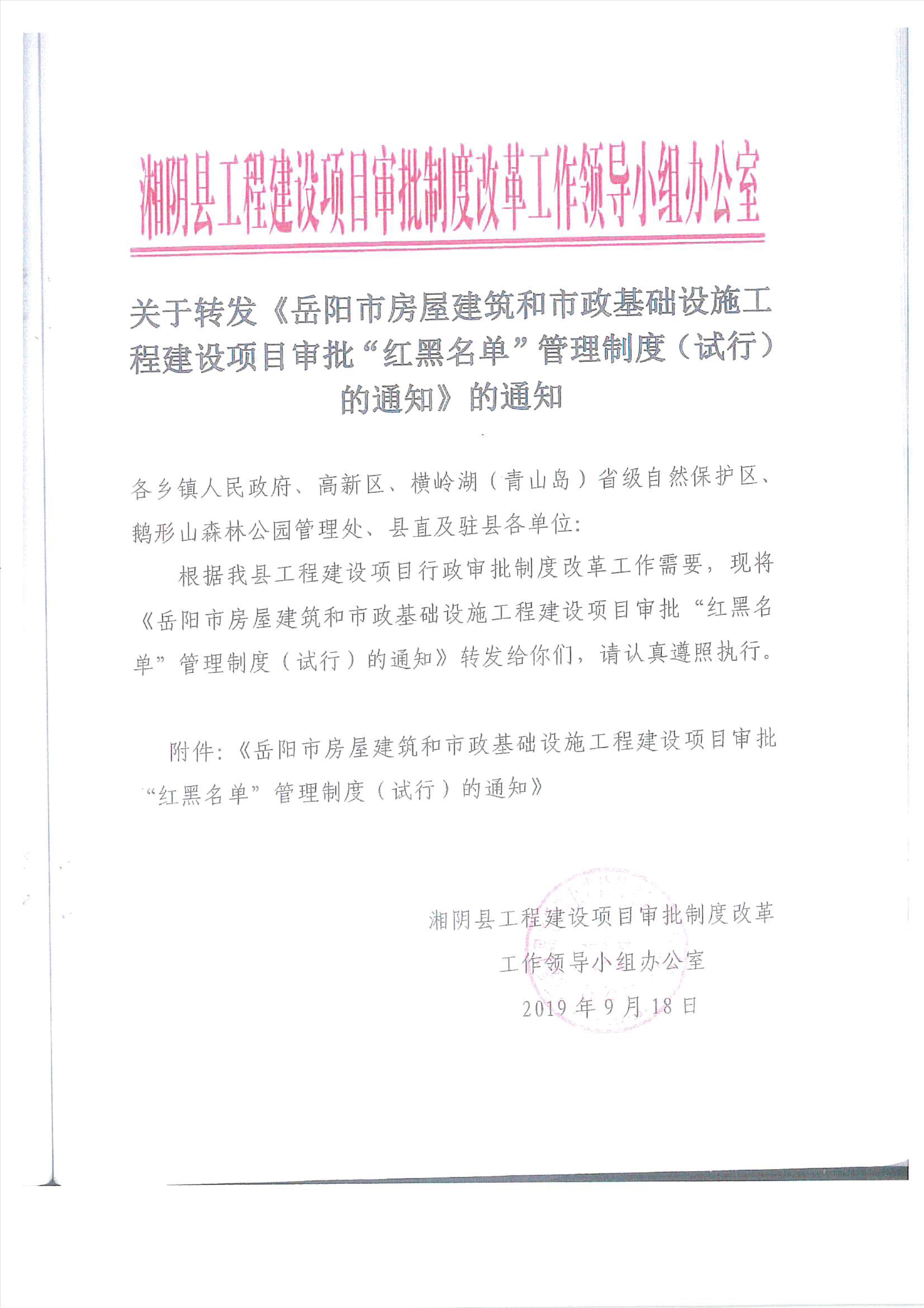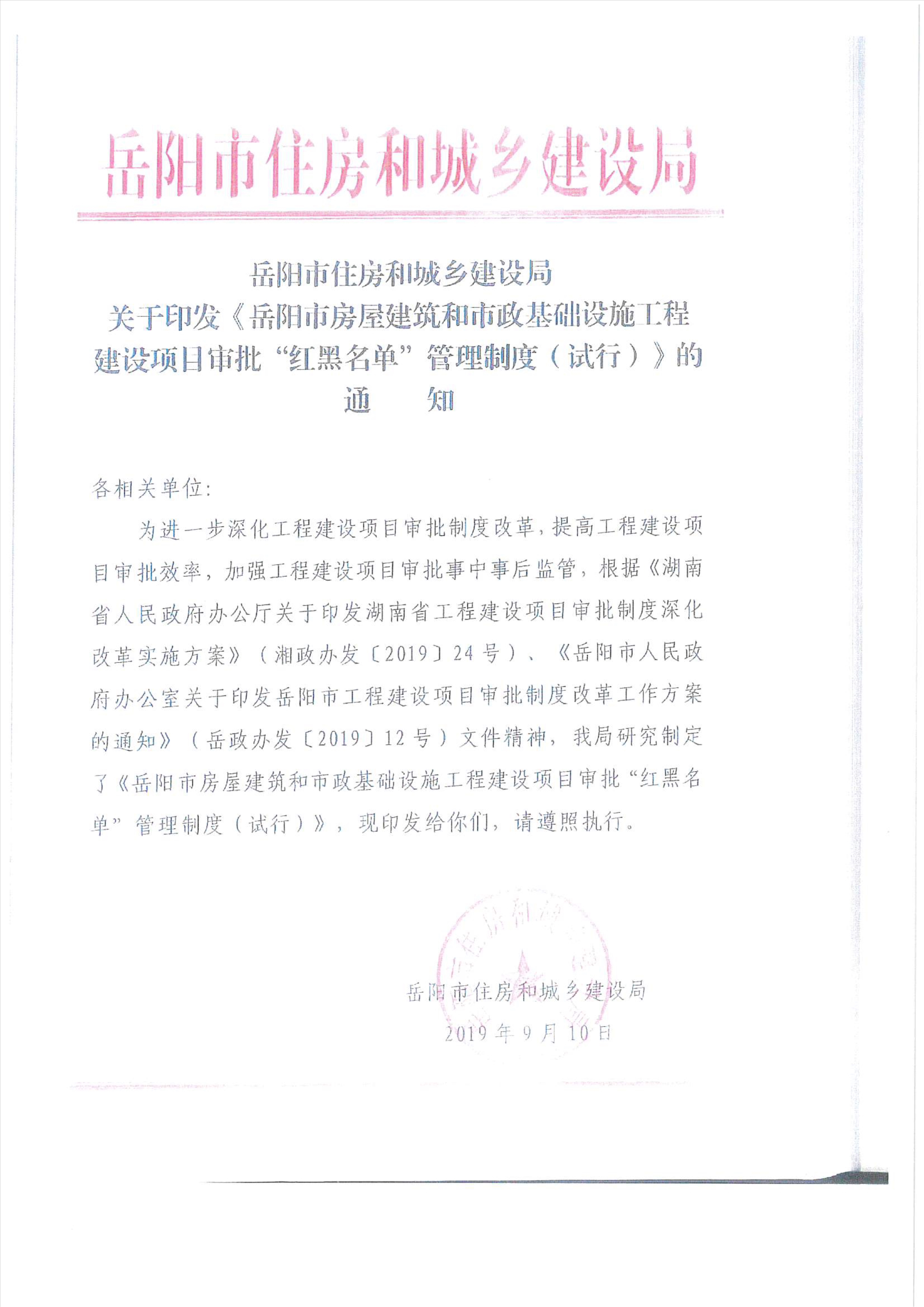 关于转发《岳阳市房屋建筑和市政基础设施工程建设项目审批“红黑名单”管理制度(试行)的通知》的通知