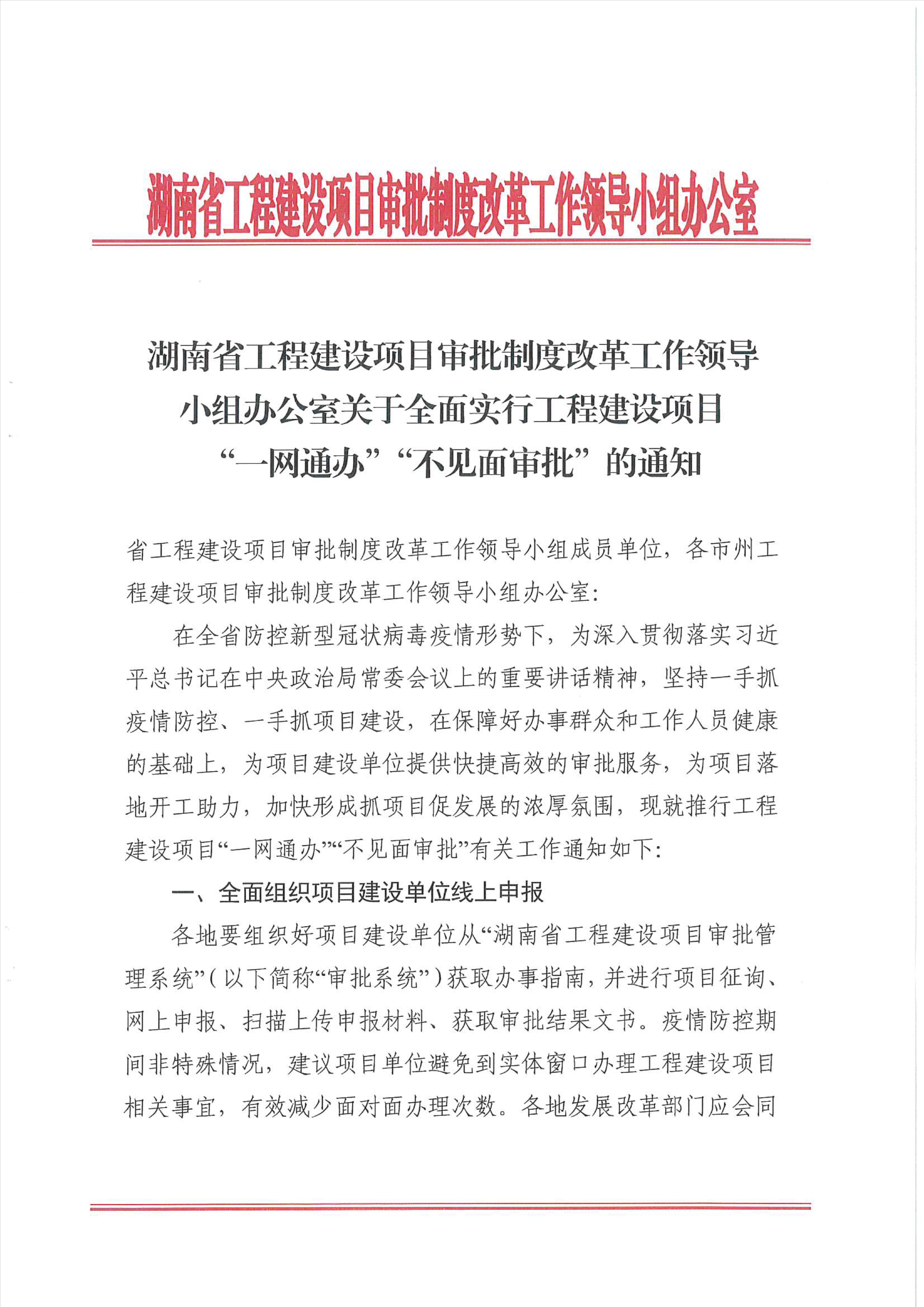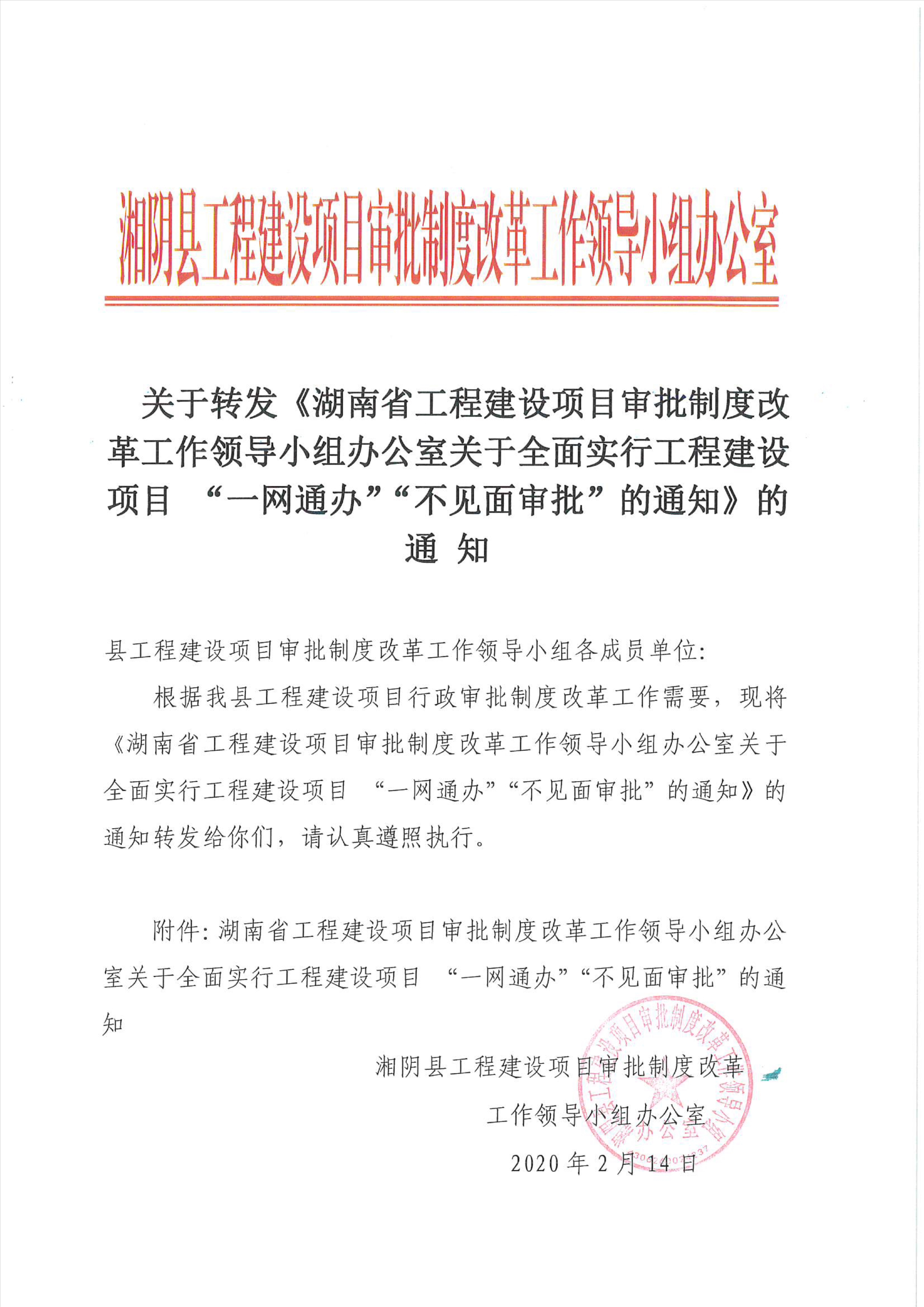关于转发《湖南省工程建设项目审批制度改革工作领导小组办公室关于全面实行工程建设项目 “一网通办”“不见面审批”的通知》的通知